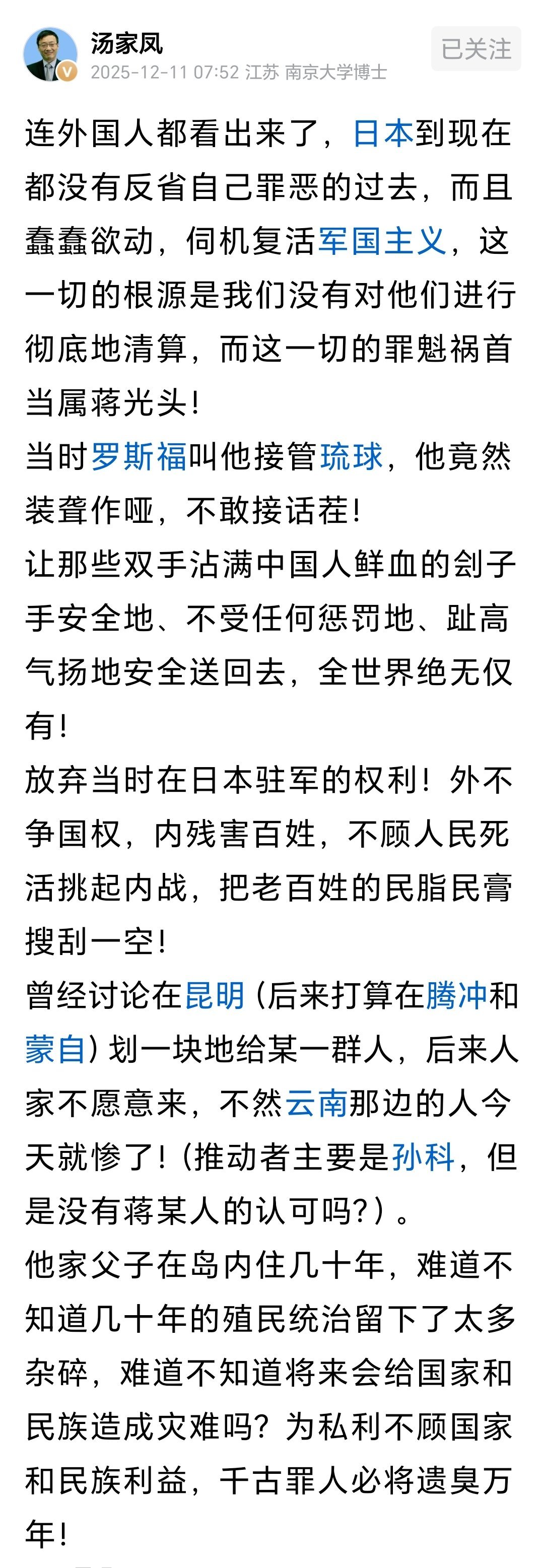 汤家凤教授:为私利不顾国家和民族利益,千古罪人必将遗臭万年!