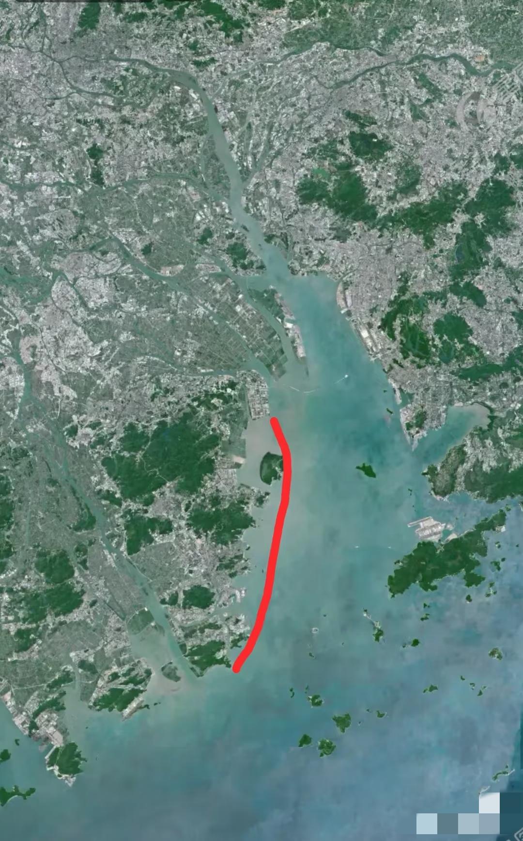 珠江出海口泥沙不断向西岸堆积,感觉红线西边区域以后会变成陆地[呲牙]