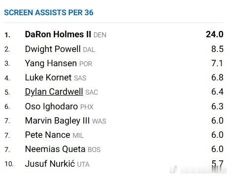 NBA 官方:杨瀚森本赛季每36分钟掩护助攻次数达到7.1次,高居联盟第三 ,仅次于达龙·霍姆斯和德怀特·鲍威尔。瀚森的掩护质量和掩护意识还是很不错的,体能、对抗再练练,掩护质量还会有质的飞跃!