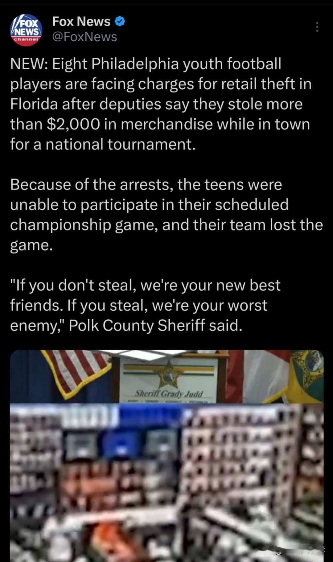 新闻:八名费城青少年足球运动员因在佛罗里达州零售盗窃超过2000美元的商品而面临指控,这些商品是在他们参加全国锦标赛期间被盗的。 由于这些逮捕,这些青少年无法参加他们预定的冠军赛,他们的球队输掉了比赛。 “如果你不偷窃,我们就是你的新朋友。如果你偷窃,我们就是你最大的敌人,”波尔克县警长说。