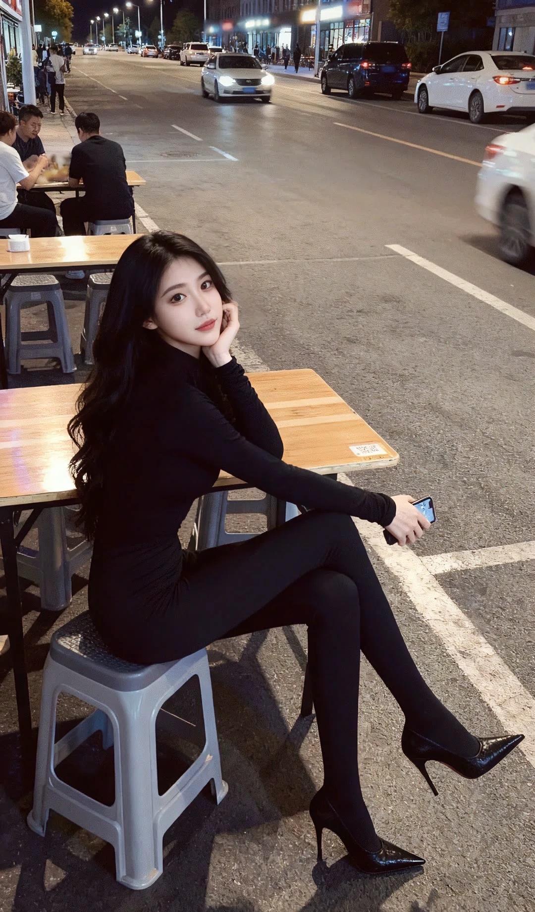 夜晚街头的时尚秘书,黑衣黑裤高跟鞋,手机相伴,尽显都市魅力。
