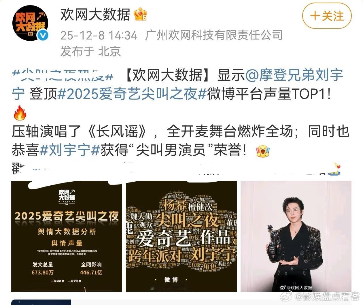 【拾遗】🥝尖叫之夜活动热度微博平台声量,刘宇宁登顶TOP1压轴献唱长风谣全开麦当晚活动焦点,尖叫男演员实在是太🔥🔥了 刘宇宁又又又又是周羽田