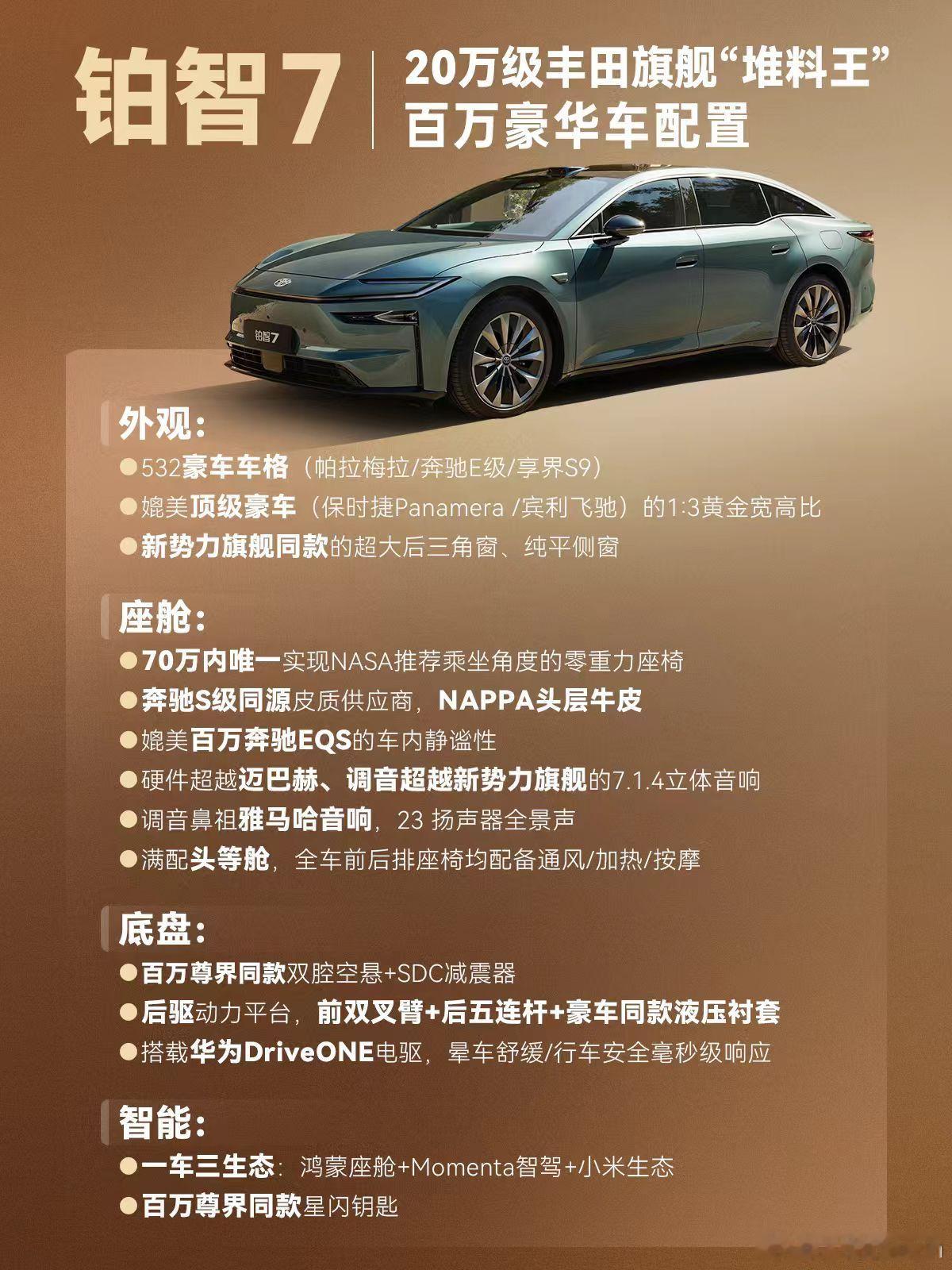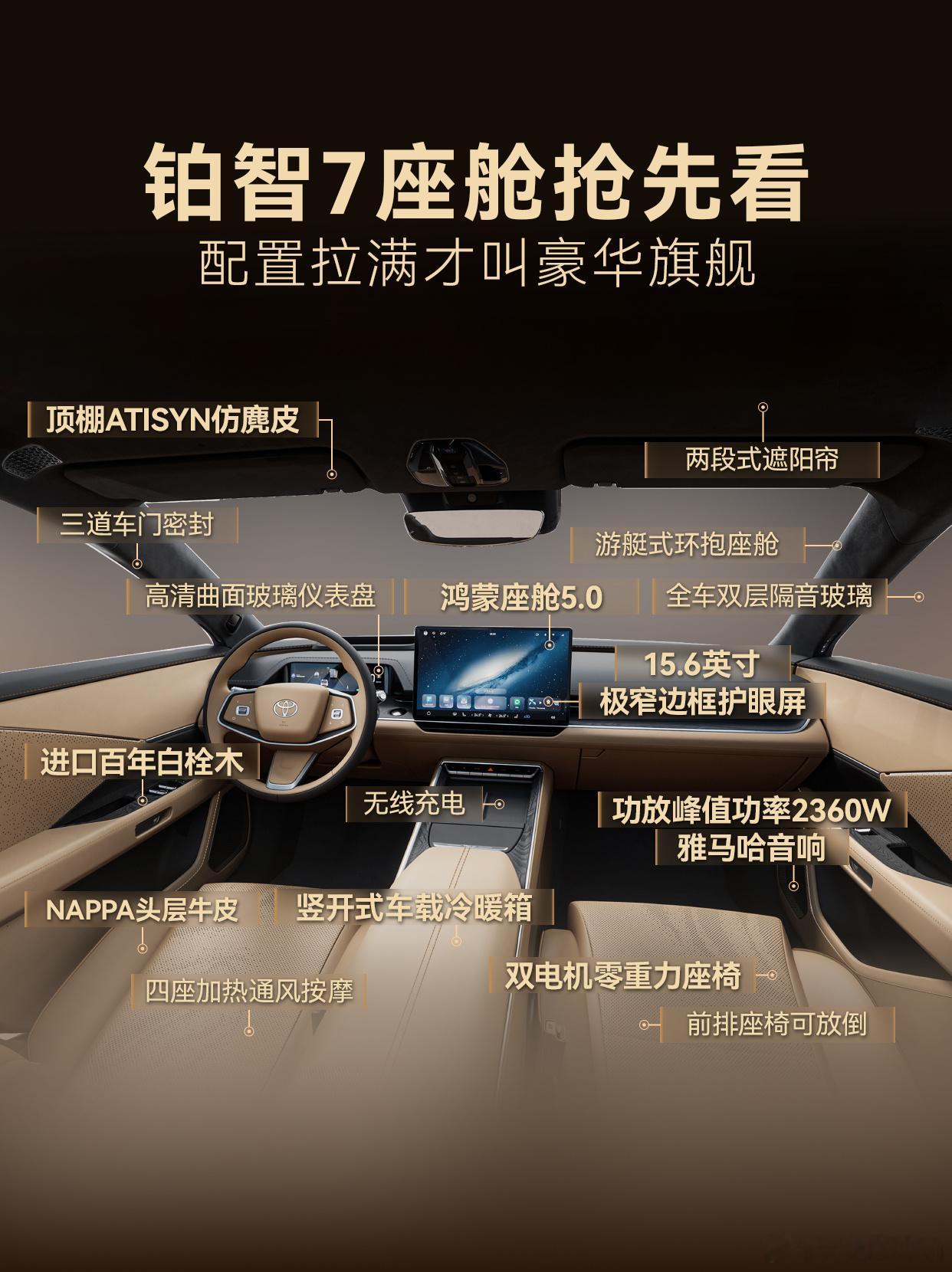 铂智7首批展车提前品鉴 想体验百万豪车的配置,又不想花大价钱?广汽丰田铂智7值得关注一下!它将于明年一季度上市,首批展车已开启提前品鉴。现在预订还有超值福利,广汽丰田推出“跨年购置税限时补贴”,2025年12月31日前预订,若因2026年购置税政策变化产生额外支出,广汽丰田直接承担,还是挺贴心的!铂智7配置堪称豪华,座舱有零重力座椅、NAPA头层牛皮,搭配23扬声器2360W雅马哈7.1.4立体音响;底盘采用双腔空悬+SDC减振器、华为Drive ONE电驱;更有“一车三生态智能”,鸿蒙座舱5.0、Momenta智驾、小米生态强强联合。此外,广汽丰田率先实现纯电车“厂家三担责”,电车自燃、智能泊车事故、电池衰减都担责。这样的铂智7,你还在等什么?明年购置税补贴退坡电车怎么买