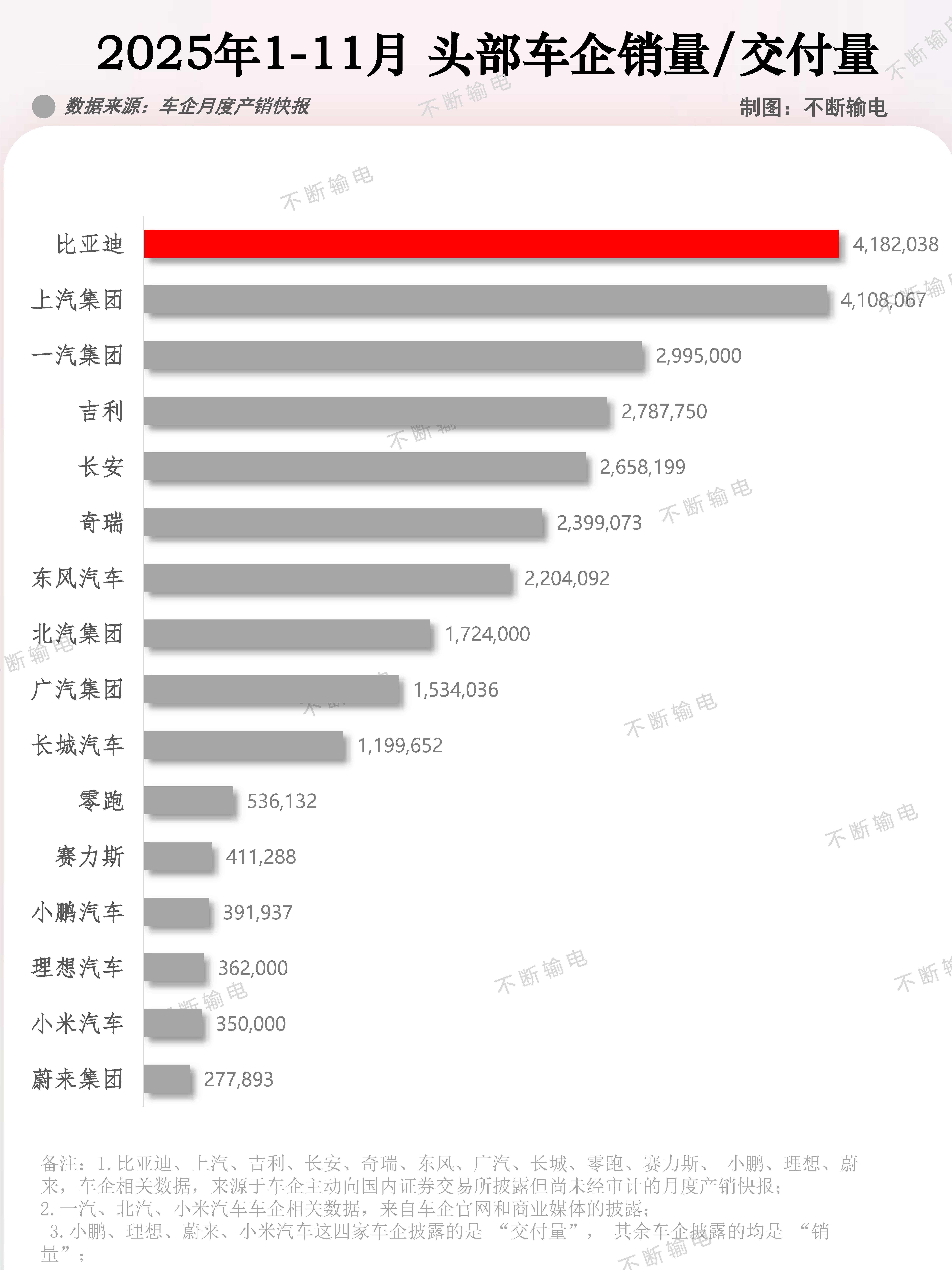 2025年1-11月份头部车企销量/交付量这个排名应该差不太多就是全年销量排名了