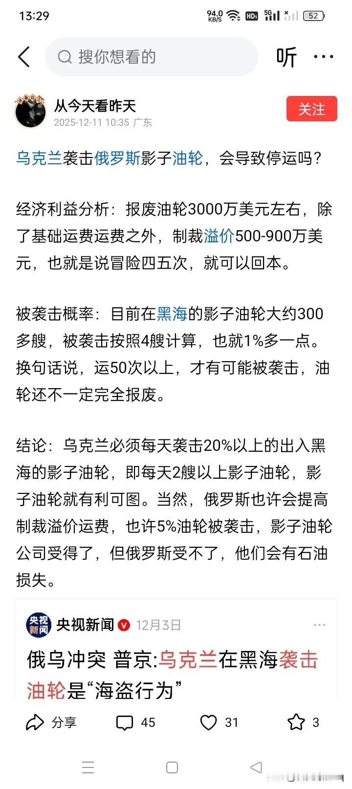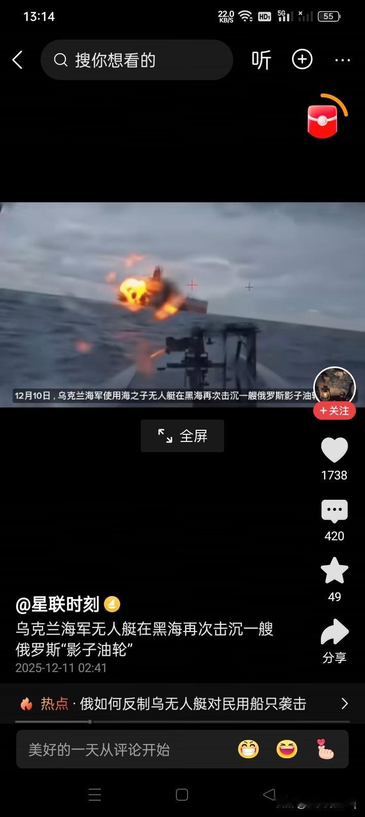这是第几艘大型油轮? 乌克兰似乎是在半个月之内才开始在黑海等海域对俄罗斯“影子舰队”,使用无人艇进行袭击。受袭击的大型油轮不是沉没,就是被严重摧毁而报废,因为“影子舰队”大多都是老旧、甚至是报废或即将报废的油轮,被俢复的可能性微乎其微,几乎没有。 10月10日,网络上有消息说,好像又有一艘“影子舰队”的大型油轮被乌克兰的无人艇成功袭击而爆炸,并且沉没。现在,大概也搞不清楚这是被乌克兰成功袭击的第五艘油轮、还是第六艘(包括被袭击的液化天然气运输轮船)。 携带大量爆炸物的无人艇,在茫茫大海之上,袭击没有任何防备设施和武器的大型油轮,成功率似乎差不多100%。 有人认为,现在乌克兰袭击俄罗斯“影子舰队”的数量不过仅占“影子舰队”油轮数量的1%多,损失与运输石油的丰厚利润相比微不足道,因此,“影子舰队”不可能中断运输。 但是,虽然乌克兰目前袭击少量“影子舰队”油轮可能不至于油轮完全停运,但俄罗斯付出的代价仍然会是十分高昂,网络上有消息说,至少两家著名的航运公司已经退出了“影子舰队”,而且保险公司也已经对在黑海航行的油轮的保险费,提高了几倍的保险费。 而且,又有多少油轮上的船员,即便是在高额的薪酬下,愿意冒着被袭击的生命危险,到黑海水域航行。 现在的问题是,乌克兰究竟拥有或生产多少的无人艇,才是以让“影子舰队”的运输完全瘫痪。