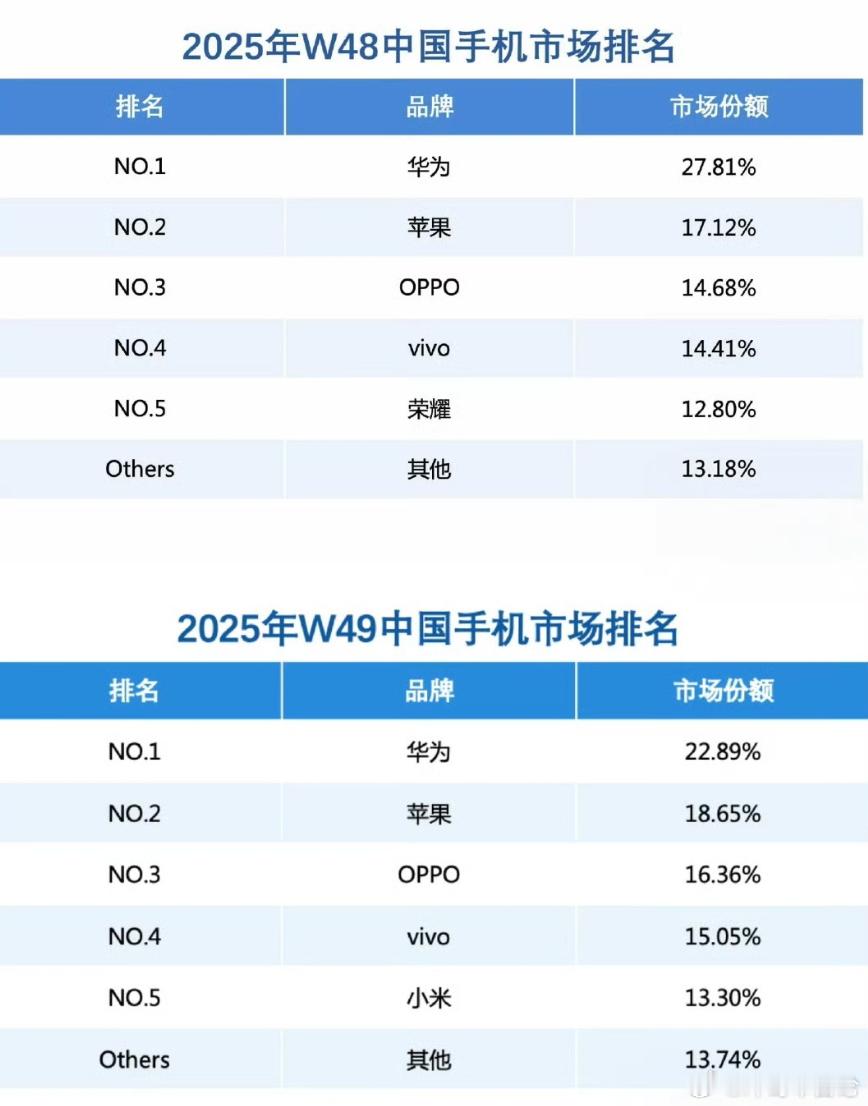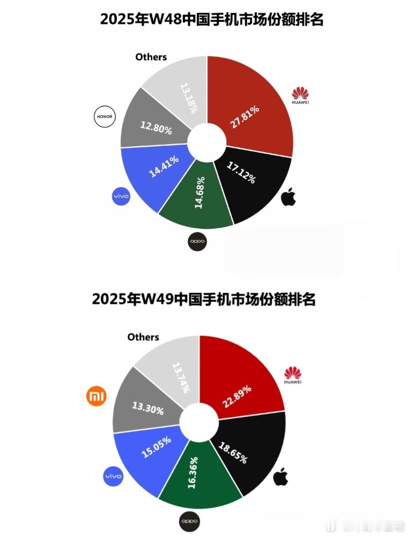 第48周(11.24-11.30)华为市场份额达27.81%,第49周(12.1-12.7)为22.89%,连续两周居首位;苹果同期份额分别为17.12%和16.2%。Mate80系列发售引爆需求,其搭载第二代红枫影像系统、14天续航、超透亮玲珑屏等技术,起售价较上代降低800元,性价比优势显著。Pro Max版本因供应不足导致二级市场溢价超1000元,Pro版溢价数百元,用户反馈“一机难求”现象普遍。2025年1-10月累计份额显示:vivo(17.04%)、小米(16.92%)分列前二,华为(15.80%)居第三。第三季度(Q3)因原生鸿蒙系统过渡期,华为份额跌至15.2%,被vivo(17.3%)反超。此次“第一”基于周度出货量数据,而全年排名多采用激活量或销量口径,机构间存在差异(如IDC、Canalys方法论不同)。600-800美元价位华为以32%居首,但800美元以上超高端市场苹果仍领先(华为占30%)。鸿蒙6系统完成“极限突围”,应用与元服务超30万项,全场景设备互联(手机/汽车/穿戴)提升体验,穿戴设备全球出货破2亿台。
