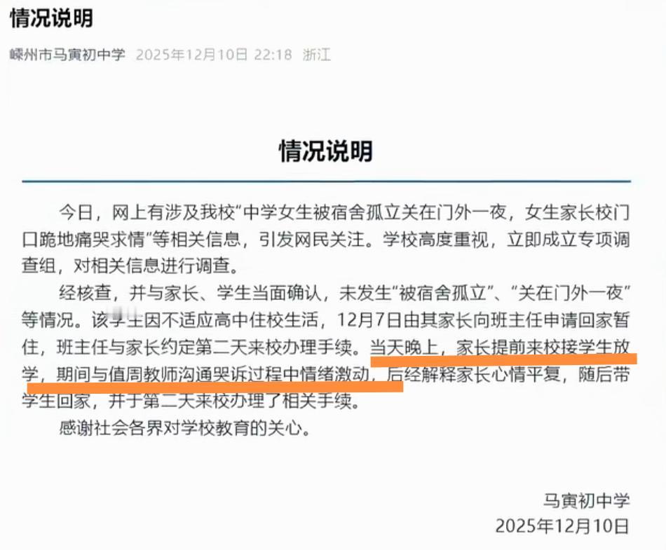 果不其然!浙江嵊州市马寅初中学辟谣了,网传“女生被宿舍孤立,关在门外一夜,女生家长校门口跪地痛哭求情”均为不实的消息。 涉事女生今年刚升高中,不适应住在学校宿舍,想回家住,当家长也非常头疼,在当晚去接孩子的时候,和值班老师倾诉后情绪崩溃,哭出了声。 过来人的经验,即然选择了学校,等于就是接受了校规,有学校简介里写明了是封闭管理,原则上是不允许学生外出的,节假日除外。 如果学生擅自外出,万一出事学校就负有管理不严的责任,所以如果学生不住校,家长和学生就必须与学校签字确认,白纸黑字以免扯皮。 另外,学校在开学初,会有个时间集中办理走读住读手续,并不是强行要求住校,有的学校走读生,要求住房离学校多远距离,房产证等材料来证明,以此来给办走读证。 推测事情是这样:女生先是听了家长的话住读,后发现不适应,想要回家,家长也有自己的事做,不可能天天接送,让女生独自一人上下学又不放心,女生在校哭闹,家长心疼情绪也崩不住了。 家长要了解,学校都是为了升学,没有那么多精力照顾那么多孩子情绪,情绪这块更多的是孩子和家长之间处理。孩子在学校不能随便玩手机,不能晚睡晚起,才哭着闹着要回家。 所以,有条件的家长要么每天包接包送,要么在学校附近租房,没条件的家长,就狠狠心让孩子住校,通常来说,高中住宿生远高于走读生,并不是很多家长有那个条件的。 高中生走读还是住校比较好 在宿舍被孤立怎么办?