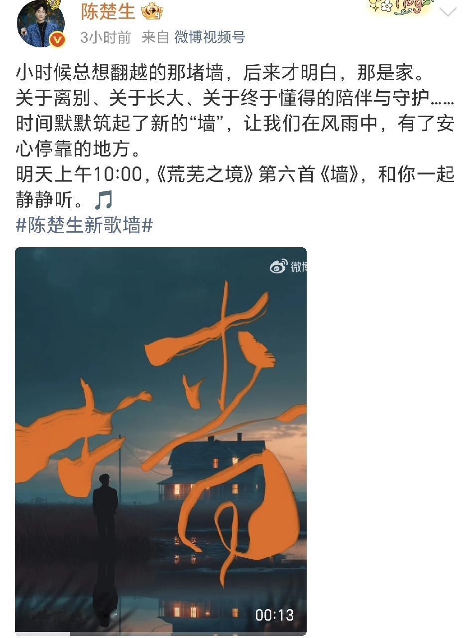 临近岁尾,没想到陈楚生接连有好消息,本月就有两首新歌上线。 一首是《长安二十四计》OST《让风保佑我们的房屋》,古风古韵,一首是《荒芜之境》系列第六首《墙》,关于成长的故事。 听陈楚生的歌,最耐听的还是这类慢节奏的抒情写意,摇滚类歌曲是可以爽一下的,而这类慢歌却是能留在心里的,时间越长久,越是深刻。 《荒芜之境》已经发表了六首歌 ,《荒岛》《远行的人》《被大雨冲刷的城市》《获奖之作》《耍赖》和《墙》,其中最出圈的当属《获奖之作》,不管是旋律还是词意都是为他量身定制的,而且又选在歌手那样一个情境之下首唱,火是必然的,初听《耍赖》会觉得有些单调,却是越听越上头,以至于几个月过后,这些歌里随口哼上一句的竟然是“我想我可以耍赖。。。”,这就是深入人心了呗。 其次比较喜欢《远行的人》,有一点轻快和自由,特别适合微微兴奋的心情,车行在路上的最佳选择。 接下来特别期待《墙》。陈楚生