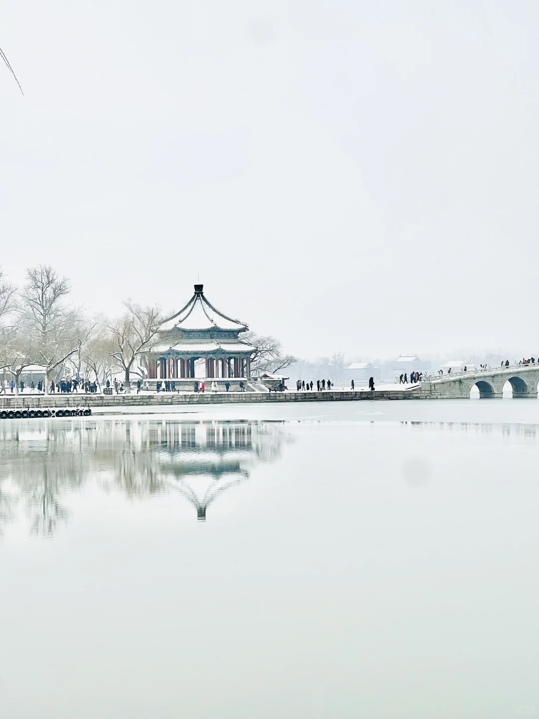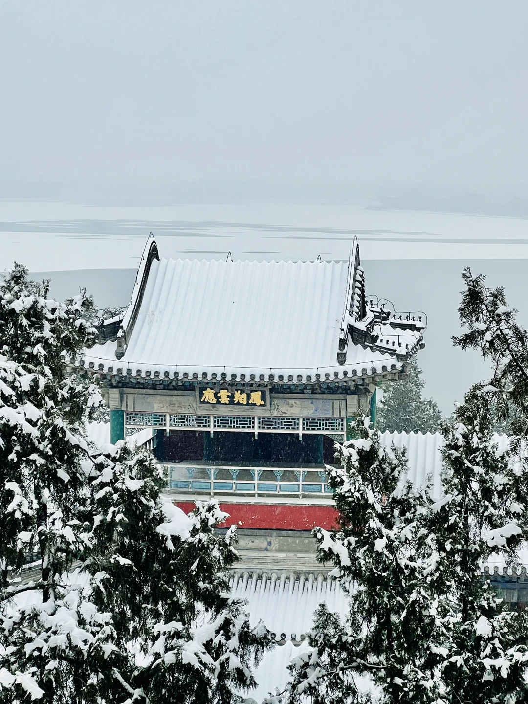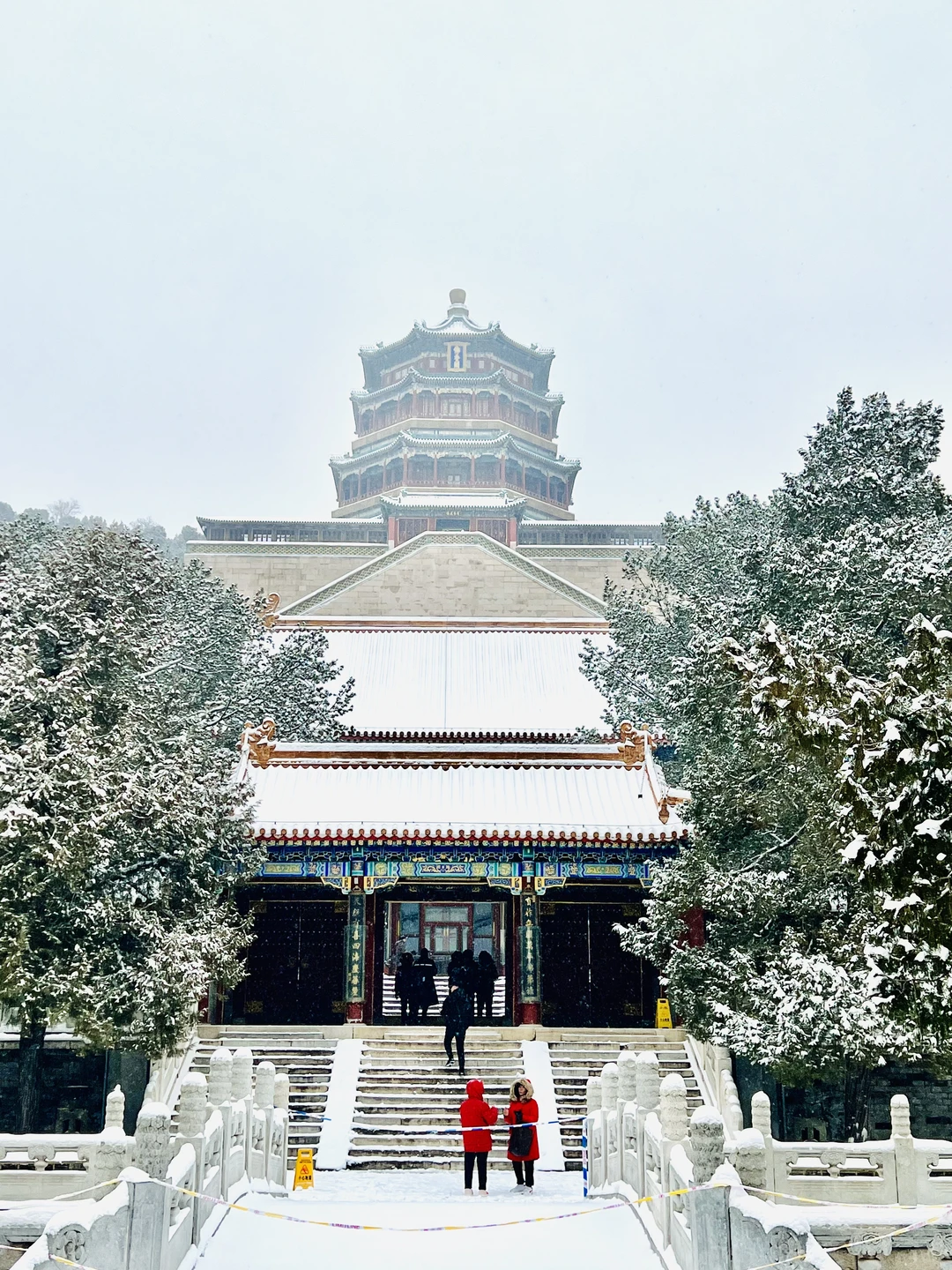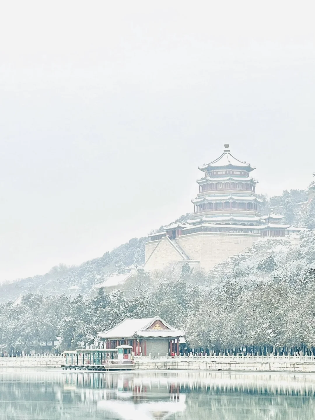 这周五北京初雪将至❄️ 冬天的正确打开方式 是在颐和园看一场北平的雪 宫墙堆雪,亭台覆白 廓如亭的飞檐挂着细雪流苏 昆明湖的冰面映着白茫茫的天 像从《千里江山图》里裁下的冬色 📌路线建设(P18) 北宫门->苏州街->四大部洲->画中游->长廊->佛香阁->十七孔桥->新建宫门 👉建议穿浅色大衣/汉服来 走在雪地里像从旧时光里走出来的人~ (温馨提示:路滑记得穿防滑鞋!)