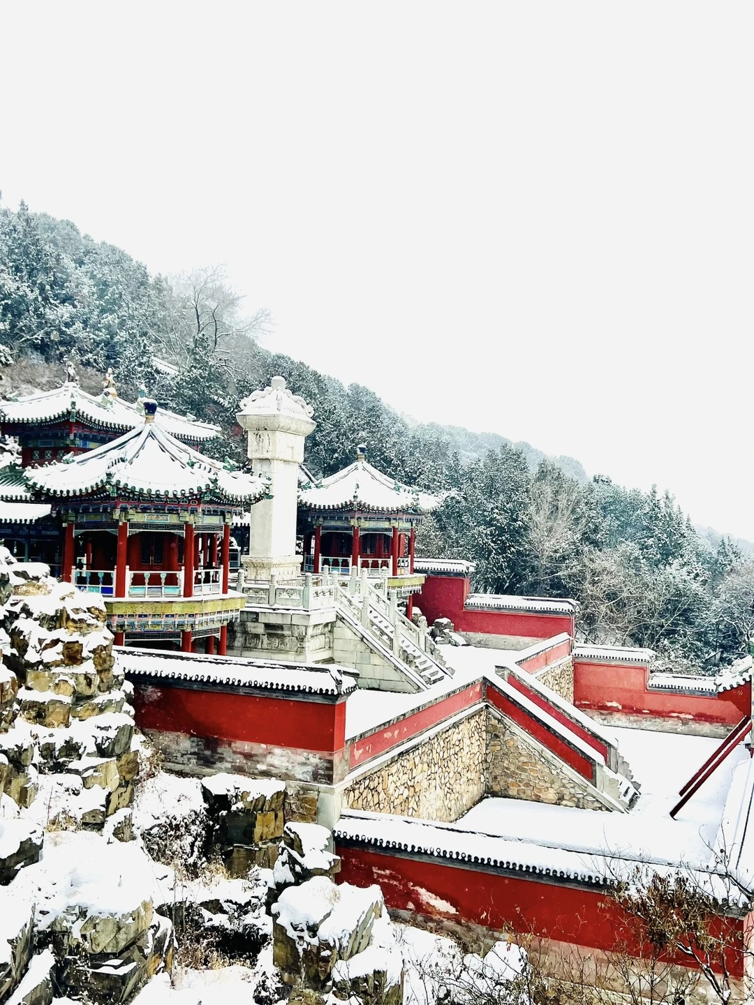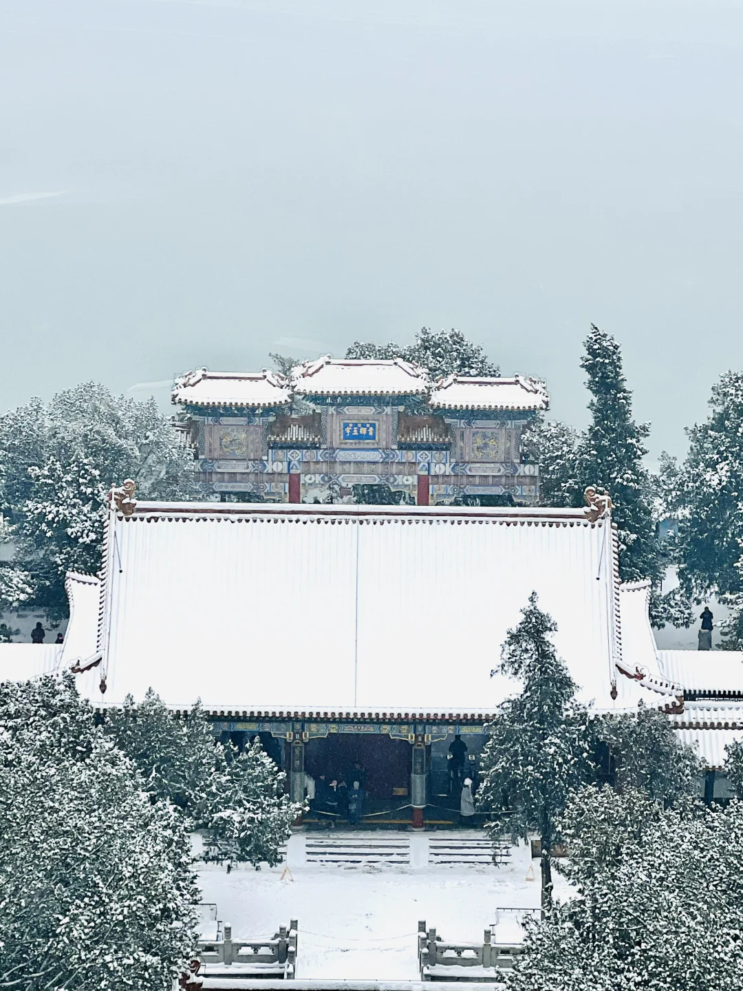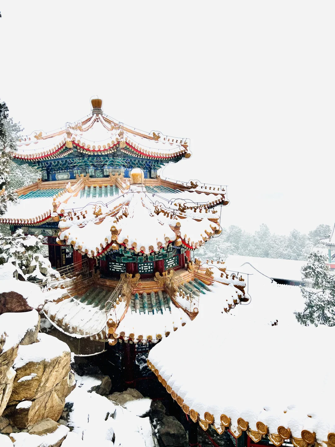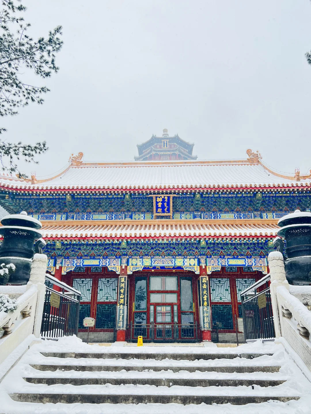 这周五北京初雪将至❄️ 冬天的正确打开方式 是在颐和园看一场北平的雪 宫墙堆雪,亭台覆白 廓如亭的飞檐挂着细雪流苏 昆明湖的冰面映着白茫茫的天 像从《千里江山图》里裁下的冬色 📌路线建设(P18) 北宫门->苏州街->四大部洲->画中游->长廊->佛香阁->十七孔桥->新建宫门 👉建议穿浅色大衣/汉服来 走在雪地里像从旧时光里走出来的人~ (温馨提示:路滑记得穿防滑鞋!)