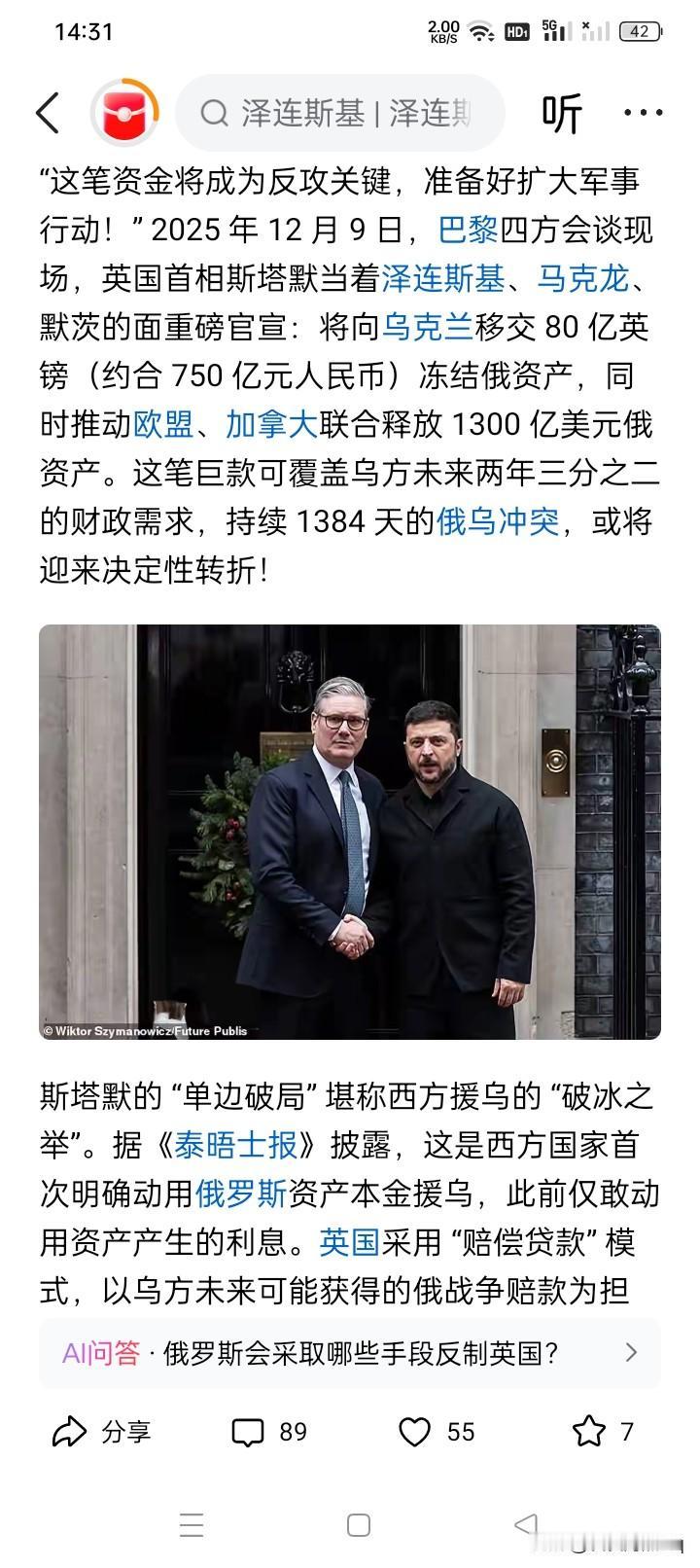 英国再次抢先一步? 当欧盟还在为是否将冻结的2000亿欧元俄罗斯资产转给乌克兰,或者作为货款抵押转交乌克兰,进行争论不休的时候,英国首相斯塔默12月9日当着德国总理默茨、法国总统马克龙和乌克兰总统泽连斯基的面,亲口说:英国将把冻结的80亿英镑(折合106亿美元)的俄罗斯资产,毫无保留的全部转交乌克兰使用。 英国再一次在乌克兰的战争中,做出了敢为天下先的行动。英国是第一个向乌克兰向派飞机,满载援助的武器送给乌克兰军队的国家,现在又以举世无双的勇气和行动,将冻结的俄罗斯资产转交给乌克兰,迈出了援助乌克兰破天荒的一大步。其实,美国好像还正在准备以西方国家冻结俄罗斯的资产,作和平协议的筹码,没想到英国已经断然釜底抽薪了。 英国作为曾经的全世界老大,虽然早已经日落西山,日渐势微,但在美国面前,似乎仍然是不怒自威。