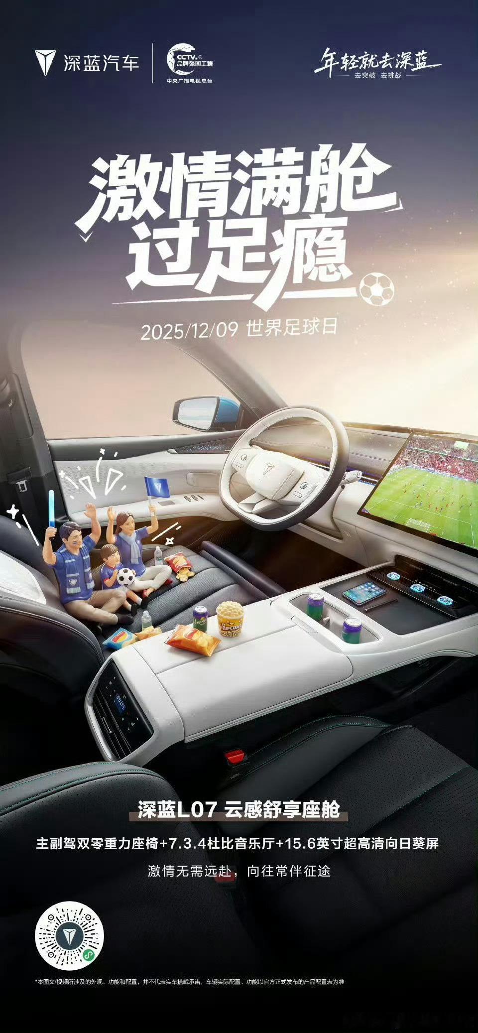 世界足球日的快乐,在深蓝L07的座舱里“过足瘾”——双零重力座椅陷进松弛,7.3.4杜比音效裹住欢呼,15.6英寸屏把赛场搬进车厢。