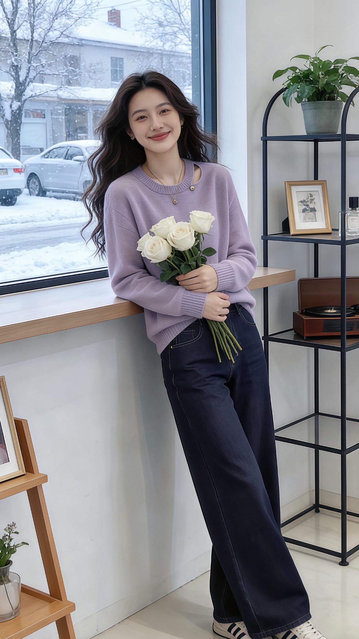 浅蓝高领打底衫➕奶白阔腿裤的搭配,清清爽爽的感觉像是把蓝天穿在身上,温...