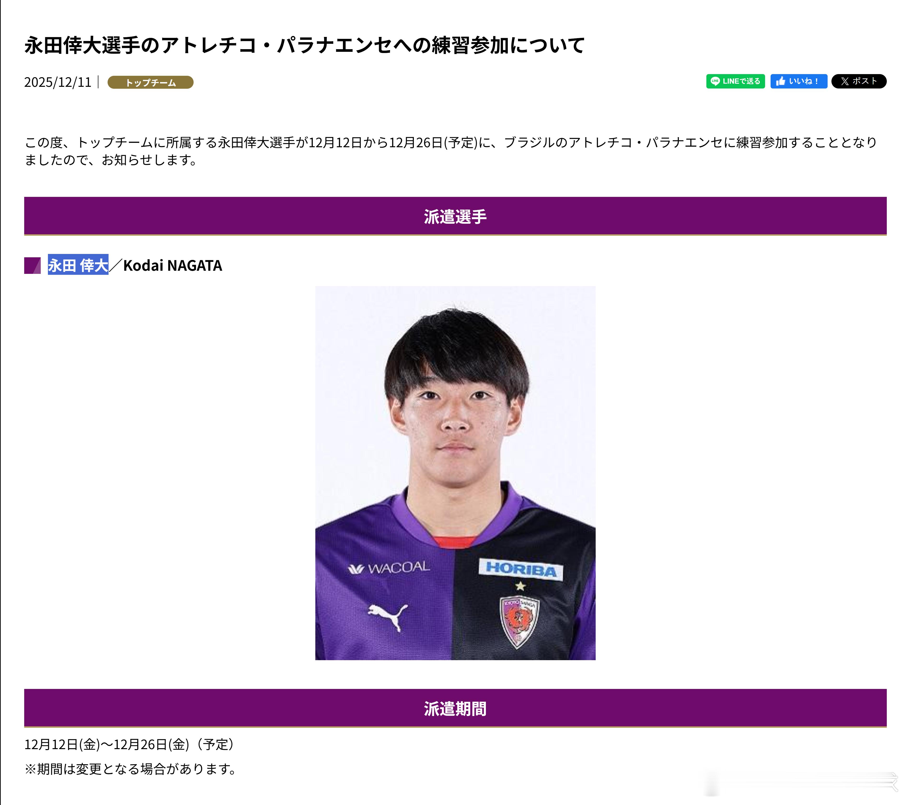 育成年代(893): 【俱乐部派遣公告】京都Sanga F.C.一线队的永田倖大选手将于12月12日至12月26日(暂定)赴巴西的Atletico Paranaense参加训练。永田 倖大/Kodai NAGATA(前所属:明治大学)中后卫,180/79, 左脚将。