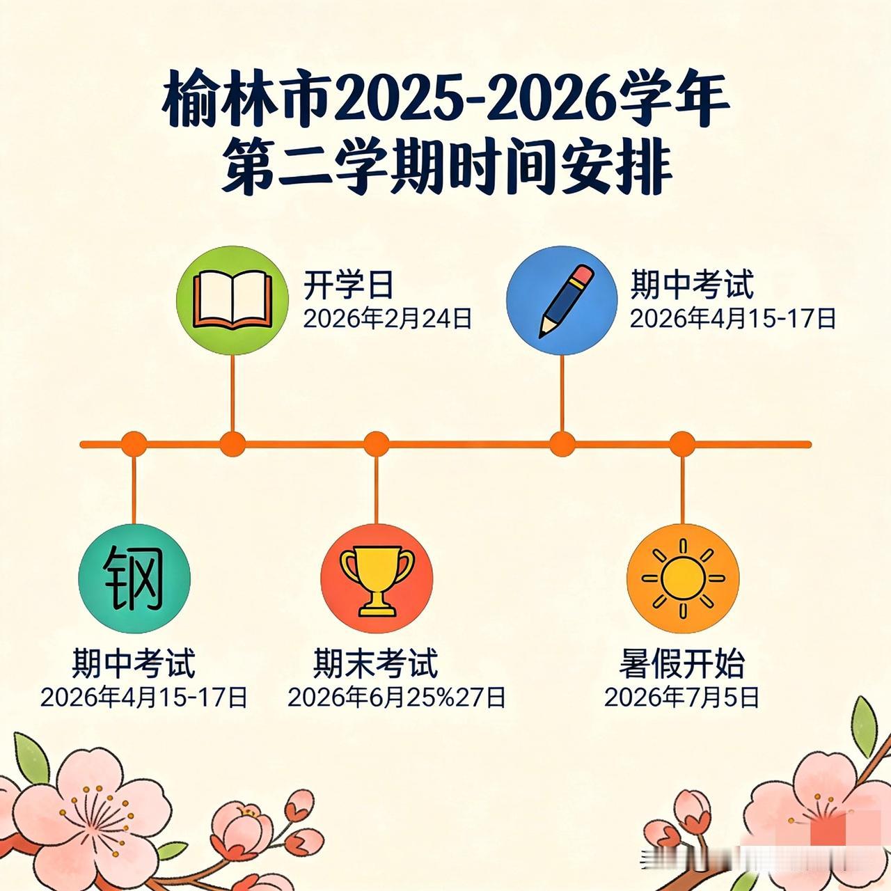 榆林家长速存!2025-2026下学期校历出炉,开学放假时间全明确! 榆林的宝爸宝妈们注意啦!教育局刚发的新学期时间安排,赶紧码住别错过~ 义务教育1-8年级、高中高一高二,3月5号正式开学,九年级跟这个时间同步哦!高三的娃要提前冲啦,2月24号就开学,比其他年级早一周,辛苦但值得呀~ 暑假时间也定了!1-8年级7月18号就能放,高一高二稍晚几天,7月25号起假,终于能好好放松啦~ 幼儿园跟着义务教育阶段走,特殊教育学校按对应学段安排就行,不用额外打听啦! 算算日子,距离开学还有俩多月,作业没写完的赶紧补,新学期要收心啦~ 家长们也可以提前规划接送和学习计划,一起迎接新学期呀! 中小学假期安排