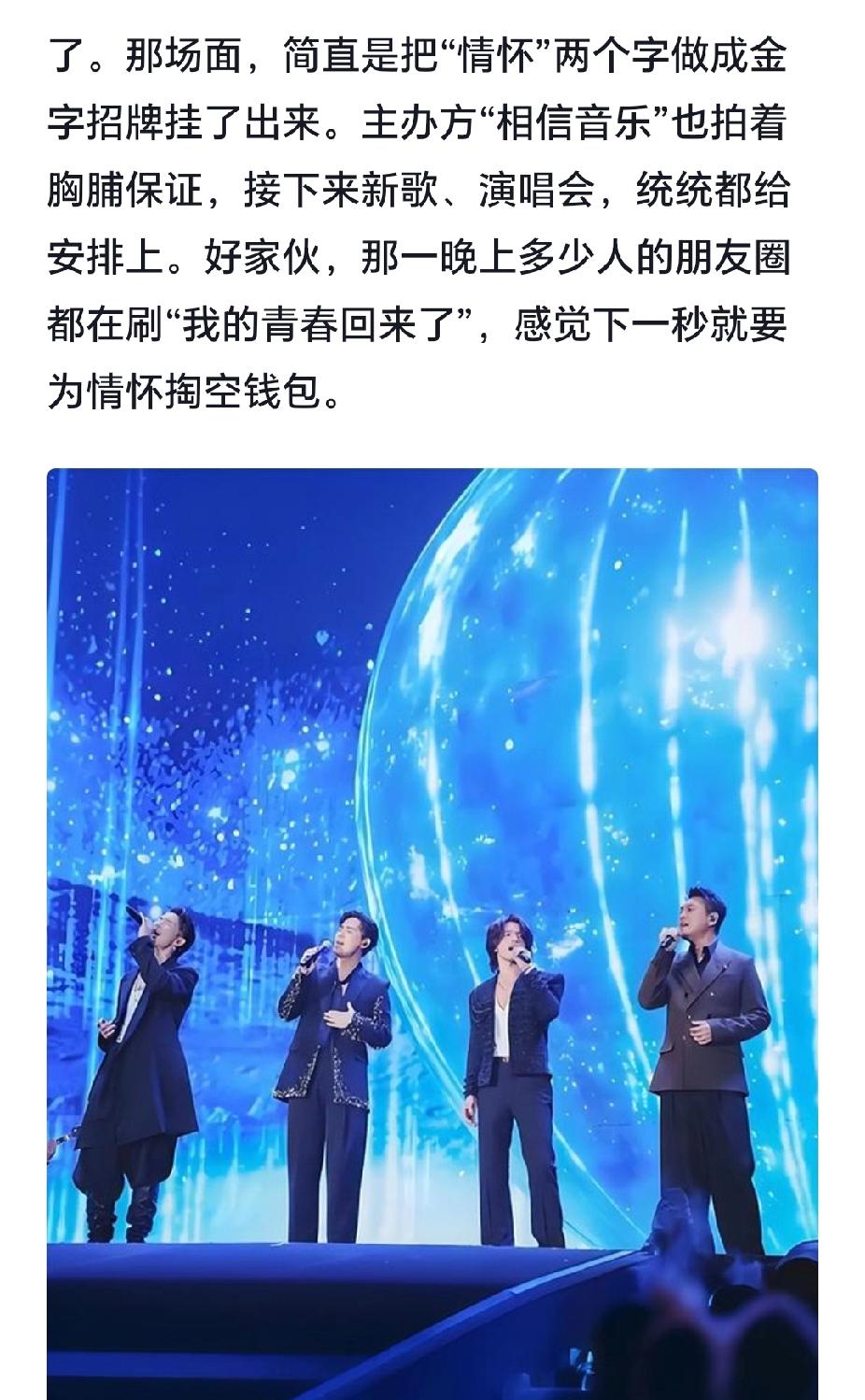【神反转】想当年,那首火遍大江南北的《流星花园》主题曲,让F4成了多少人的青春回忆。今年7月,他们还在五月天的演唱会上意外同框,当时多少粉丝看得眼泪汪汪。可谁也没料到,到了11月筹备巡演的时候,朱孝天却突然被踢出了团队,这事儿一下子就在网上吵翻了天。 在直播里,朱孝天委屈巴巴地喊冤,说自己平白无故就被踢出团队,还拐弯抹角地说自己被人故意黑。可网友们却发现他说话颠三倒四:一会儿说"只是意向合作",一会儿又改口说"对方早就联系自己两年了"。更让人尴尬的是,五月天的经纪人直接发了条微博回怼,就八个字:"请回头看看自己先!" 后来大家才知道,其实在直播的时候,朱孝天就把演唱会的不少细节给说漏嘴了,这一下可把团队弄得特别被动。网友们看到这操作,都忍不住吐槽他是"行走的自爆机",连其他三位(F3)都懒得出来帮他说话。想当年在西门町,他还是那个风度翩翩的"西门",可现在却因为管不住自己的嘴栽了跟头,真应了那句老话说的:"人要是太狂,麻烦肯定少不了!" (配图建议:F4经典剧照+朱孝天近况对比图) 你觉得,这事儿到底是谁的错?是团队太不近人情,还是朱孝天自己确实得好好反省反省?要是你是F4成员,会怎么处理这事儿?