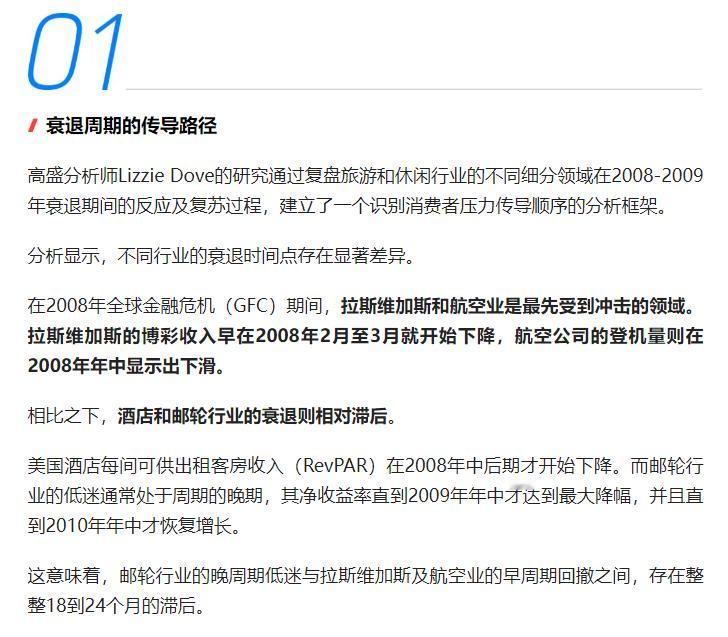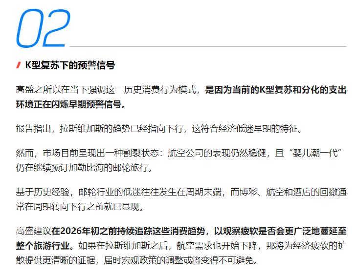 高盛分析师指出,目前的消费者支出环境正在发出早期预警信号,其特征与2008年金融危机前夕几乎如出一辙,拉斯维加斯的博彩收入再次成为衡量经济周期的“领头羊”。 据由Lizzie Dove领导的高盛分析团队发布的报告,拉斯维加斯的消费趋势已经开始走低,这重现了当年经济衰退早期的疲软迹象。 与此同时,尽管目前的消费环境呈现K型分化和双轨特征,但这一早期信号值得市场高度警惕。 原文来自:华尔街见闻《高盛拉响警报:2008年危险信号又出现了!》