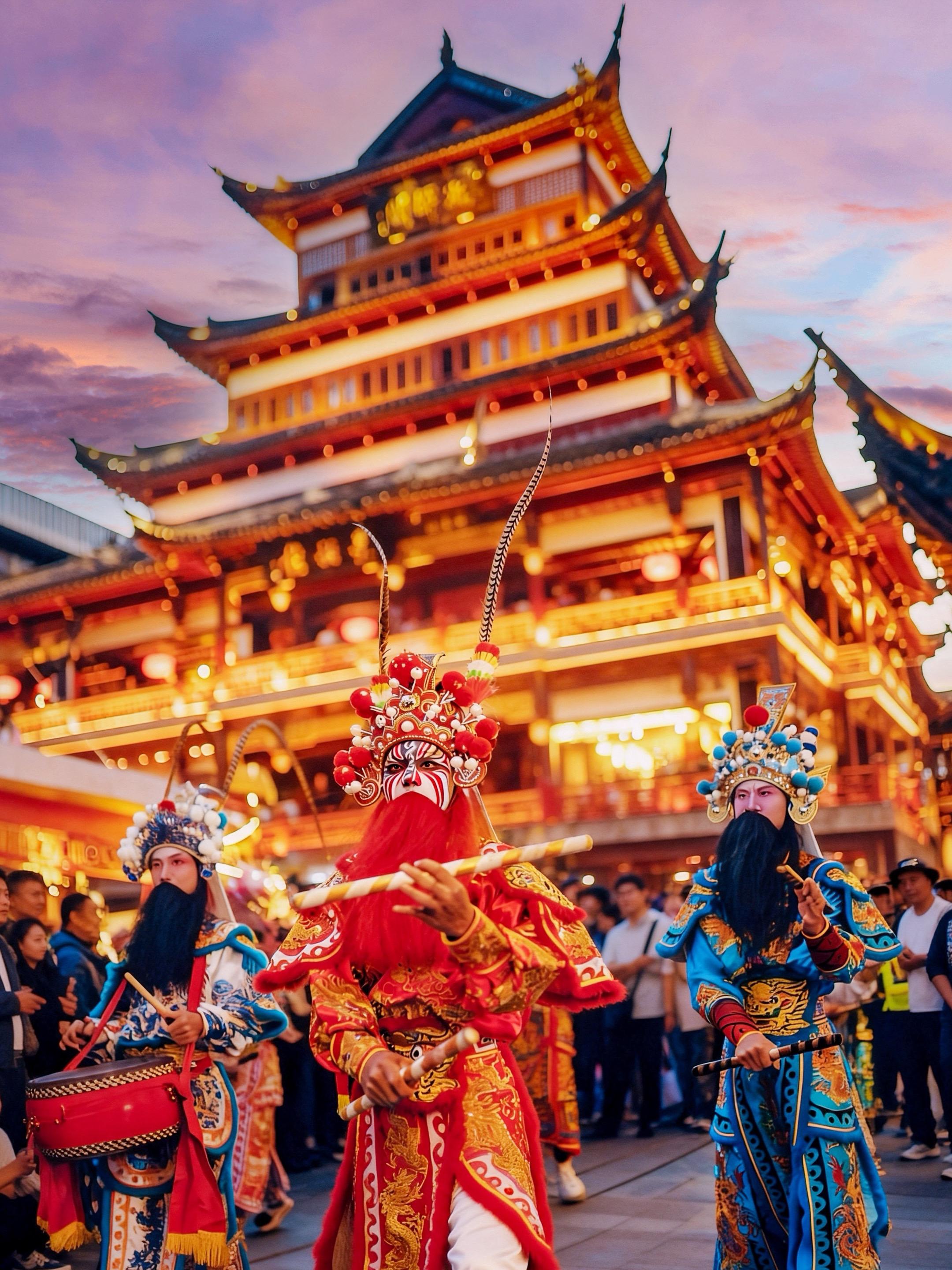 上海最好的地方都是免费的❗️ 在上海的姐妹!这个月不去豫园真的亏大! 非遗不再是教科书里的词, 是看得见、听得着、跟着跳起来的“东方热血”! 关键是:免费、免费、免费(重要的事情说三遍) . 我周末和姐妹去上海玩, 居然意外收获了一场令全身鸡皮疙瘩炸裂的东方战舞! 谁懂啊‼️ 在豫园灯光亮起的瞬间,当你沉浸于古人诗中“不知天上宫阙,今夕是何年”的时候, 远处红绸翻飞,锣鼓震天, 演员们画着彩绘脸谱,身穿传统“铠甲”, 手持英歌槌整齐砸击—— 每一步都踏出千年的力量感! 仿佛穿越到潮汕民俗现场, 那种扑面而来