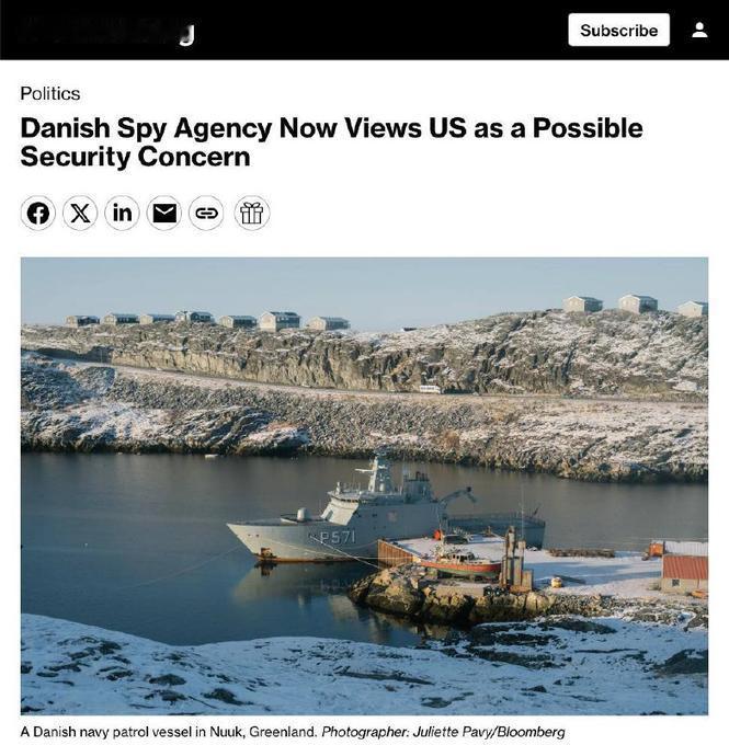 丹麦情报机构将美国列为安全威胁。 彭博社于2025年12月10日独家报道,丹麦国防情报局在其2025年年度威胁评估报告中,首次将美国列为潜在安全威胁。这标志着作为美国在北约的长期盟友的丹麦对华盛顿的战略转向表达了公开担忧。 报告强调,美国正“越来越多地优先考虑自身利益,并利用其经济和技术实力作为权力工具”,包括在与盟友的关系中。 这份报告是DDIS年度展望的一部分,通常聚焦外部威胁,此次纳入美国是历史性转变。 CNN和《纽约时报》称此为“跨大西洋联盟的警钟”,欧洲多国私下有相同共鸣。