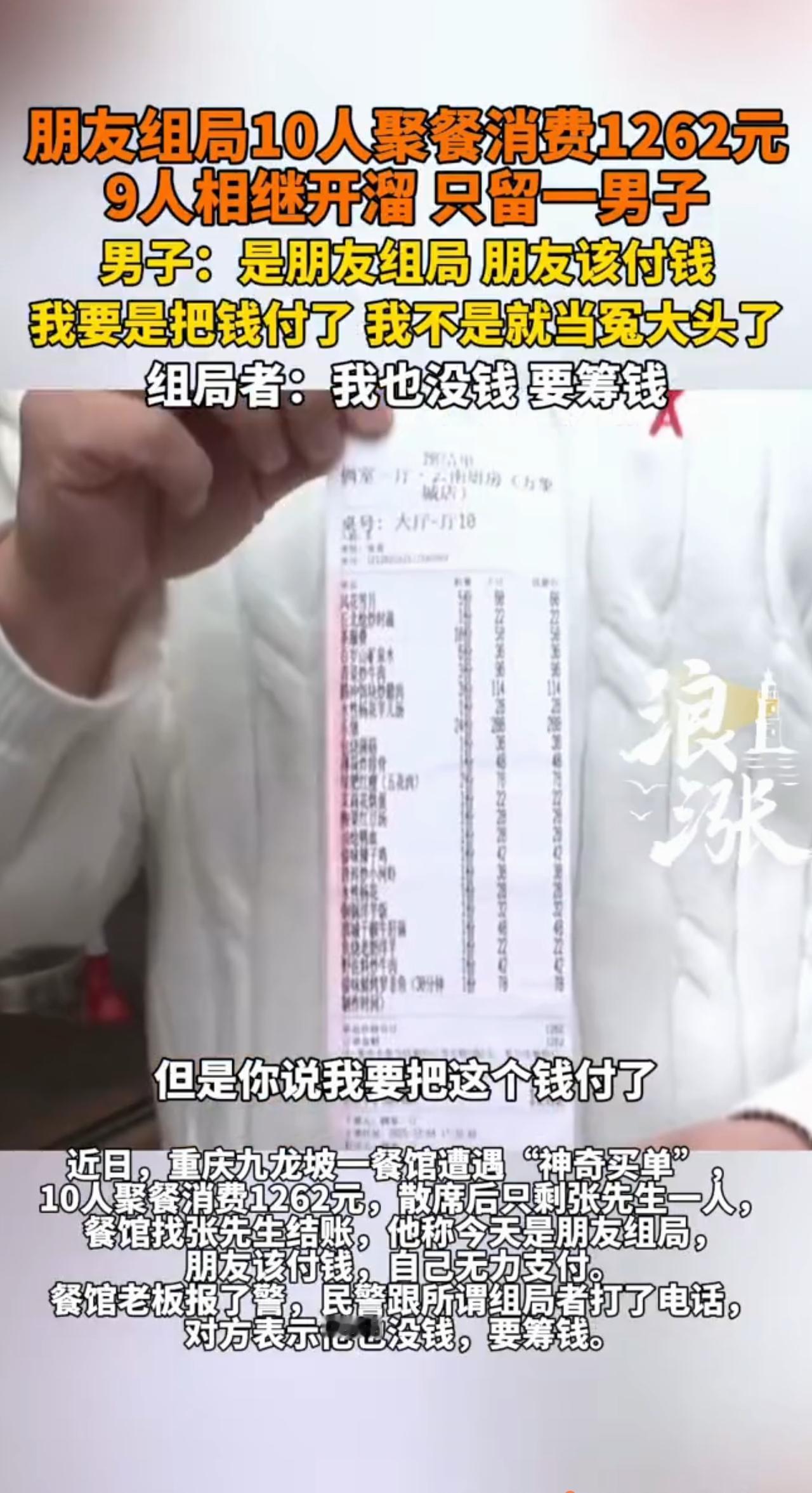 10人聚餐散场只剩1人,1262元账单谁来付? 重庆九龙坡一家餐馆里,上演了一出令人哭笑不得的“逃单大戏”。原本热热闹闹的10人聚餐,酒足饭饱后众人却相继找借口开溜,最后只留下张先生一人,面对桌上那笔1262元的消费账单。 面对餐馆老板的结账要求,张先生一脸无奈:“这局是朋友组的,按理说该他掏钱,我现在身上根本没这么多钱。”老板见沟通无果,只能选择报警求助。 民警到场后,尝试联系那位组局的朋友,对方在电话里倒是坦诚,直言自己也囊中羞涩,需要时间筹钱。在民警的协调下,张先生写下了付款承诺书,还押了身份证,承诺第二天下午6点前结清账单。 可谁也没想到,等到第二天约定的时间,张先生却反悔了。原来他一整晚都联系不上组局的朋友,这下彻底成了“冤大头”,自然不愿独自买单。 这事传到网上,网友们炸开了锅。有网友吐槽:“这哪是朋友,分明是‘坑友’!10个人凑不出1200多?跑单的操作太下头了。”也有网友替张先生抱不平:“被朋友坑惨了,押身份证的时候得多憋屈。”还有人调侃:“以后聚餐先AA收款,不然谁都别想动筷子!” 在我看来,这事里最无辜的就是餐馆老板,开门做生意没招谁没惹谁,平白无故被卷入这场闹剧。而那些溜之大吉的人,更是把朋友情谊踩在了脚下,一顿饭看清一群人,也算给张先生上了一课。 那么从法律角度看,这事该怎么算?律师明确表示,张先生既然签了承诺书,就有义务支付这笔餐费。至于他和朋友之间的纠纷,可以按照当初的约定去分担费用或者追偿。如果餐馆最终还是收不到钱,也可以通过诉讼途径维护自己的合法权益。 同事聚餐结束,到底应该由谁买单 你和朋友们一起聚会一般谁买单 人与人之间就不可以真诚一点吗?