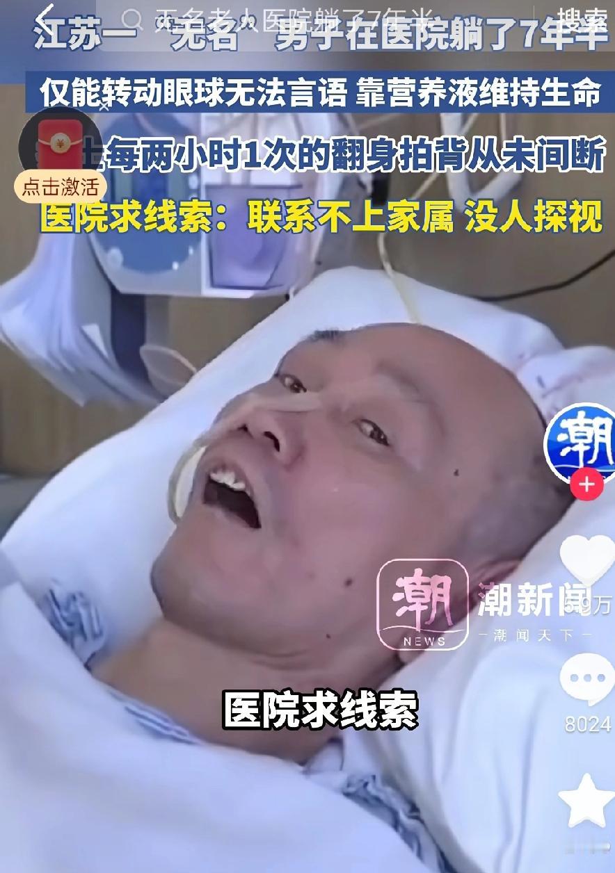 江苏有位“无名”大哥,在医院里一住就是七年半,这些天,医护人员天天守着他,就盼着他的家人能来看看他!2018年5月的时候,他因为深度昏迷被送到医院,当时情况特别危急,抢救了好几天,人是救回来了,可舌头和手脚都不听使唤了,眼睛倒是还能跟着东西转——这是他唯一能动的地方。 七年多了,医院的人都叫他“无名”,每天都把他照顾得妥妥帖帖:两小时就得翻一次身、拍拍背,喂饭、擦身子更是每天都有。光翻身就翻了快两万次,可他身上愣是没起过一点褥疮,也没得过肺炎。有护士说过:“每次给他翻身,他的眼睛都会跟着我们的手转,那眼神啊,就像在说‘谢谢’,这大概就是他唯一的‘话’了。” 医院这些年没少想办法联系他的家人,可一直没联系上;警察也拍了照片去打比对,还是没找到人。最近有媒体报道了他的事,当地公安知道后,专门开了绿色通道,赶紧启动了DNA比对程序。这位看起来有五十到六十岁、身高大概一米七的大哥,在病床上躺了两千七百多个白天黑夜。护士们总爱跟他说话:“给你刷牙的时候,我会跟你说今天天气好不好;你看窗外的树又绿了,我也会告诉你……就想让他知道,有人一直惦记着他,在乎他。” 他的家人到底在哪里?也许,下一秒就会传来好消息……