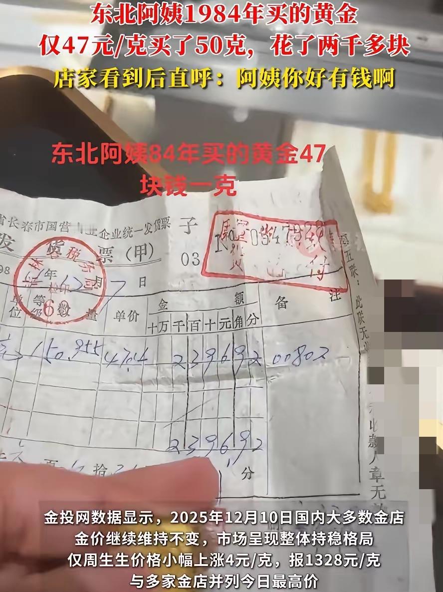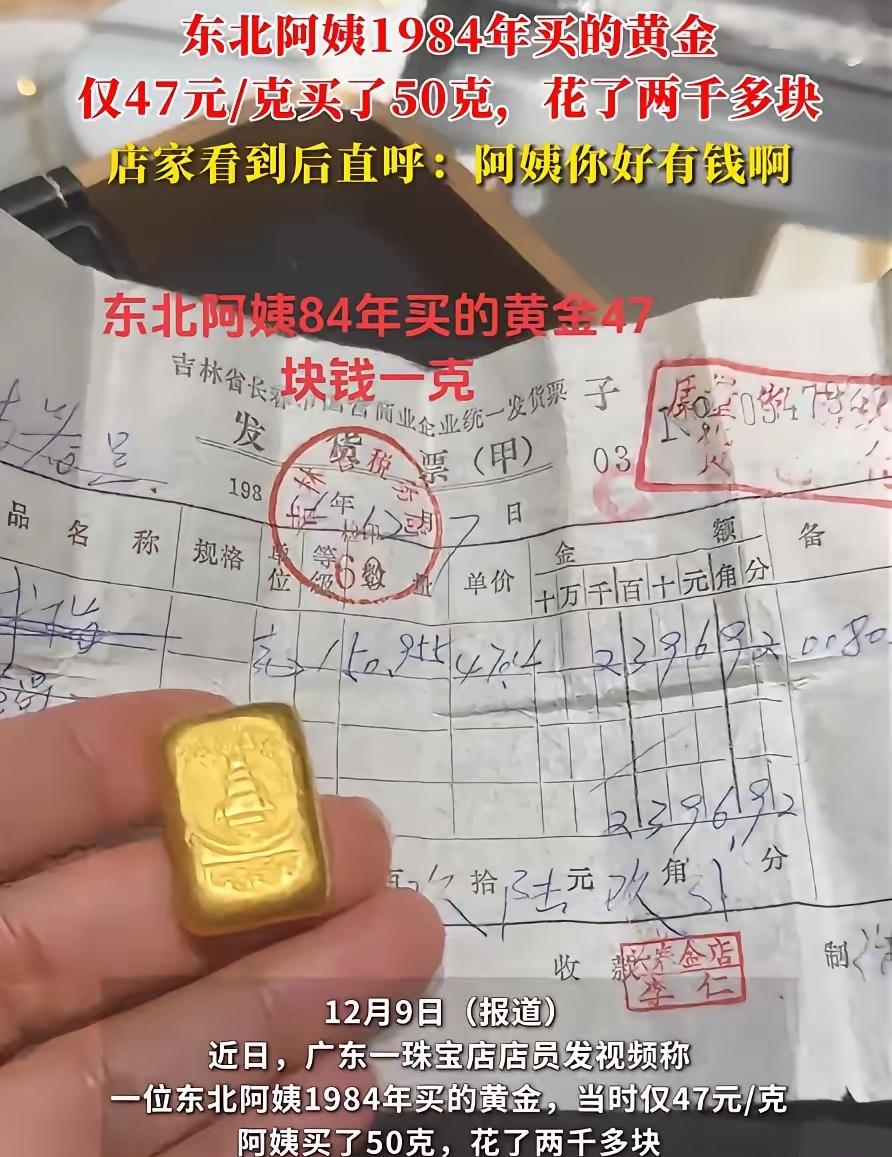 “亏大了!”广东,一家珠宝店走进来一位东北大姨,大姨拿出一个50克的金子想让店员帮忙看一下,不料,店员看到收据上日期写着1984年,直接惊讶表示:大姨你好有钱啊!可网友帮忙算了一笔账后,发现过了这么多年,大姨并没有赚到 说实话,单看金价,大姨确实没跑赢时代,这一点算得一点都不冤。1984年,能一口气掏出两千多买黄金,那可是妥妥的“家里有矿”的感觉,按当年的工资水平,真是把几年积蓄都砸进去了。现在金价再怎么涨,折算成今天的收入水平,看起来就没那么“香”了,难怪网友说她“亏大发了”。 但我觉得,这事儿如果只盯着数字,就有点太势利了。那时候买金,哪是为了理财,更多是给自己留个底气,给家里留个压箱底的东西。这四十年里,可能家里有困难的时候,大姨也想过要不要把它卖了,但最后还是舍不得,这一留,就留成了一段人生。对她来说,这50克金子,不只是金属,更像是一张老照片、一件旧棉袄,看着不起眼,却陪着她从青丝到白发。 所以,别老拿“亏不亏”来衡量一切,有些东西,本来就不是用来赚钱的。真正聪明的人,是既懂得算账,也懂得算情。你要是大姨,现在会把这块金子卖了,还是继续留着?欢迎在评论区说说你的选择。