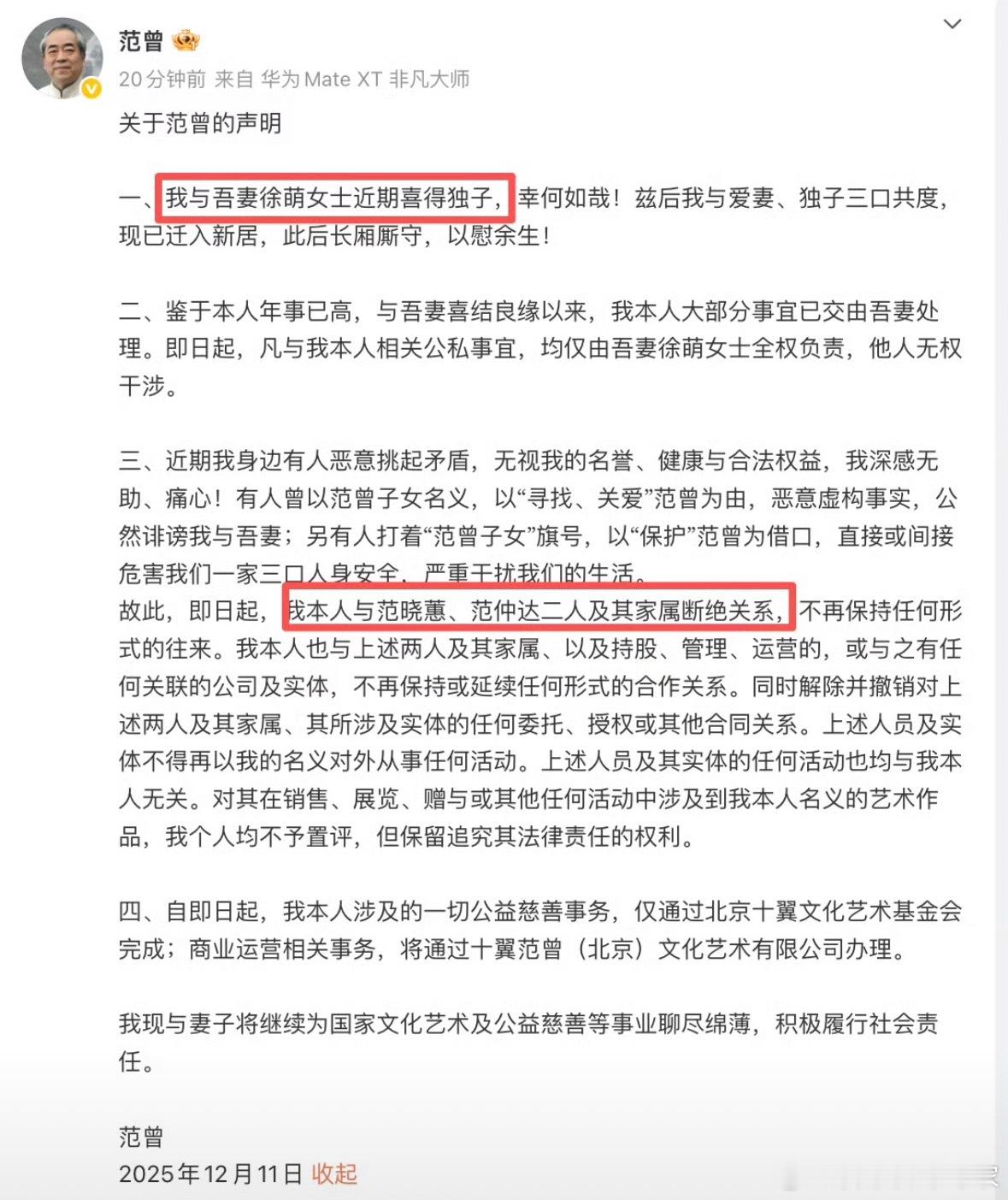 没看错就是87岁,画和字非常有艺术,很好,身体很好,他妻子是90后,但是他不是有女儿吗?为什么断绝关系了87岁画家范曾喜获独子 范曾宣布与女儿继子断绝关系