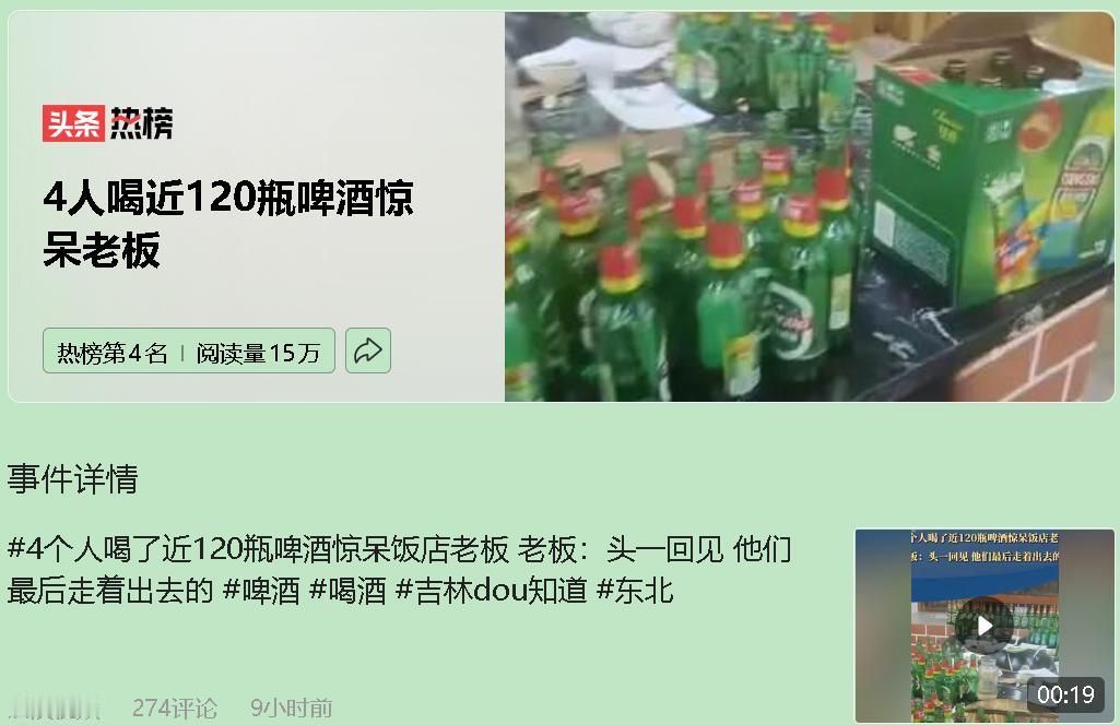 你以为这是酒量好?别天真了!4个人干掉120瓶啤酒还能走着出去,这根本不是本事,是玩命!老板都看傻了,说头一回见。但我告诉你,这纯属走运,下次可能就没这运气了。 不信?江苏就有过类似的事——也是4个人,在KTV喝了100多瓶啤酒加半瓶洋酒。结果呢?一个兄弟喝晕了,趴窗口吐,直接坠楼没了。法院判了:他自己得担70%责!KTM只赔了点钱。你看,同样的疯狂喝酒,一个成了段子,一个成了悲剧。差在哪儿?就差那么一点“运气”。 为什么总有人拿命喝?说白了就几个歪理:第一,觉得酒量代表面子,不喝倒不算朋友。这哪是情义?这是对自己对别人都不负责!第二,根本不知道酒精多可怕。喝大了,人连危险都感觉不到,窗边都敢趴,楼梯都敢摔。第三,总抱着侥幸:“上次没事,这次也行”——这是在赌命,而且迟早输。 所以我一点不觉得这新闻该夸。它就该是个反面教材!真正厉害的人,是知道什么时候停下。你的身体不是你自己一个人的,你倒了,家可能就塌了。也别光看热闹,甚至学着喝——你看到的只是他们走着出去,没看到肝脏心脏快累死了。 说点实在的:酒桌上,该拒就拒。真朋友不会往死里灌你。看见喝多的,帮忙送一下,别光拍视频。店家也长点心,该安的防护安上,别等出事再赔钱。 总之,拿酒量逞强,是最蠢的事。这次四个人没事,是偶然;那个坠楼的兄弟,才是这种喝法最可怕的结局。这热闹一点不好看,散了吧。