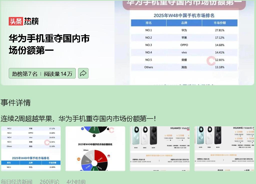 看到“华为份额第一”刷屏,我第一反应是:得,今天又得吵一天。但你仔细品,这事真那么热血吗?要我说,这第一眼下还是“虚火”,别急着沸腾。 为啥?这第一是“周冠军”,可不是“年冠”。数据漂亮是因为Mate 80开售那周爆了,直接干到近28%。可你把时间拉长点看呢?今年1到10月,华为总份额在国内还排第三,前面是vivo和小米。这就好比马拉松刚跑完一个上坡,你就喊冲线了,后面路还长着呢。 Mate 80是颗“限量核弹”,炸得猛,可惜产能没跟上。定价是真香,比上一代便宜八百,开售秒光。可Pro以上型号全在缺货,现在下单还得等好几周。这说明啥?现货根本供不上。双11为啥份额跌了?就是因为新机发布时间完美错过大促。供应链这道坎,华为还没完全迈过去。 别光盯华为,苹果其实稳得很。 这边热闹,人家双11销量翻着倍涨,高端盘根本不动。华为抢回来的,大部分还是原来安卓阵营的用户。想动摇苹果那群铁粉?难。 所以冷静点。华为回归是好事,证明产品够硬、定价实在就有人买单。但光有爆款不够,得能稳定出货才算真厉害。现在像是个惊艳的狙击手,可战场需要的是能持续开火的重炮营。 乐见其成,也别捧杀。高端局这才刚开打,让产能和销量再跑一会儿。咱们用户坐等受益就行——他们越卷,咱们越香。华为手机重夺国内市场份额第一MCN双量进阶计划“鸿蒙”系统+华为手机,你们会支持吗