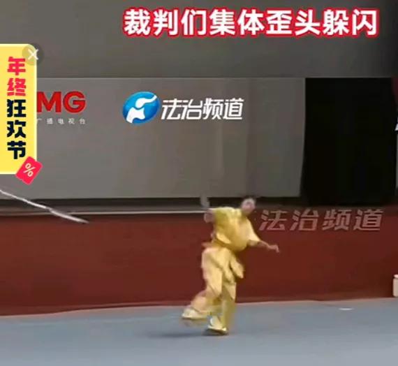 下一秒的意外。耍棍女子手滑,棍子从手中飞出,直奔裁判台,评委们低头躲过。原来是虚惊一场。