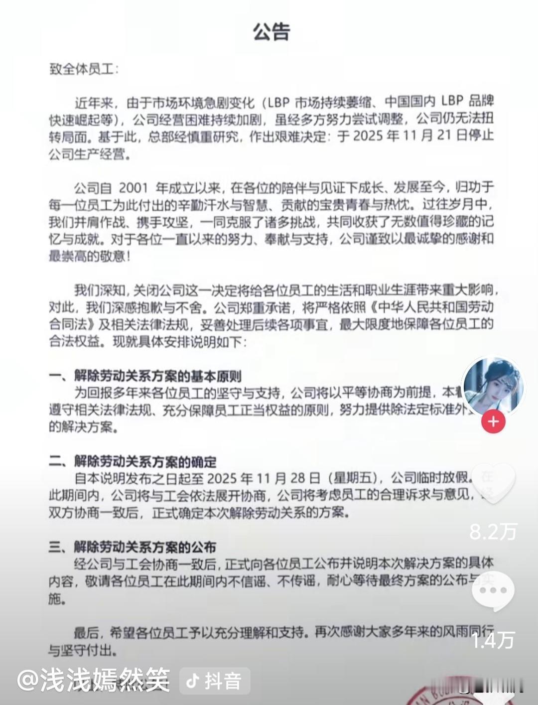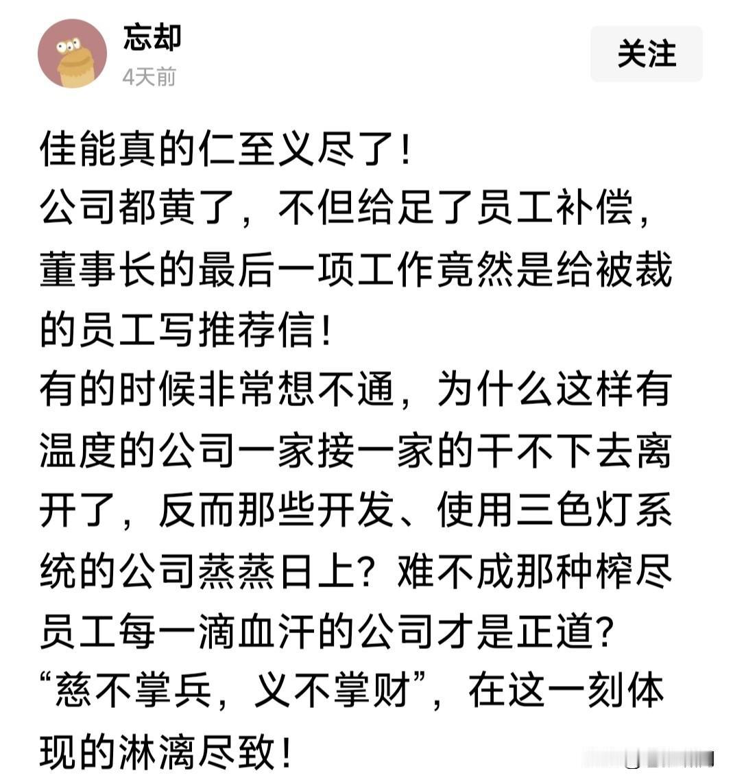 “佳能中山”关门,补偿员工2.5+1!董事长对员工致歉,妥善安排善后事宜,为有能力的员工介绍工作。 该做的事情做完,董事长小泽秀树才最后离开中国。他本想悄悄离开,但他到达机场,却发现难以如愿。 几百名员工早等在那里,见他到达马上冲破保安涌入机场,只求最后见他一面,致使飞机迟飞18分钟。 佳能几百名员工,为何对公司总裁如此留恋?这是“U型锁”无法理解的。佳能在中国经营几十年,不仅解决他们的就业,还为中国交了不少税。 外国企业在华经营,基本都遵守中国法律,尤其“劳动法”和“税法”,这是不能含糊的。而且对员工普遍较好,这是法律规定,也是企业的责任。 不说别的,只说解决社会就业!资料显示在华外国企业,总数达几十万家,主要是美欧日韩新澳发达国家。 其中美韩日,数量名列前三位。试想这几十万家外企,为社会解决多少就业岗位?为国家上交多少税收呢? 至于对待员工,整体情况知道不多。但知道一些马斯克“特斯拉”上海工厂的情况,他们应和特斯拉类同吧? 我们总把外企老板,叫“资本家”!把中国企业的老板,叫“企业家”。其实本质有什么区别呢?都是投资做生意,都要挣钱纳税,并为社会做贡献。 苍狼觉得无论外企国企民企,本质都是做生意挣钱,都是“资本家”!只要他们照章纳税善待员工,为社会做贡献!我们都应欢迎,并保护其权益! …………
