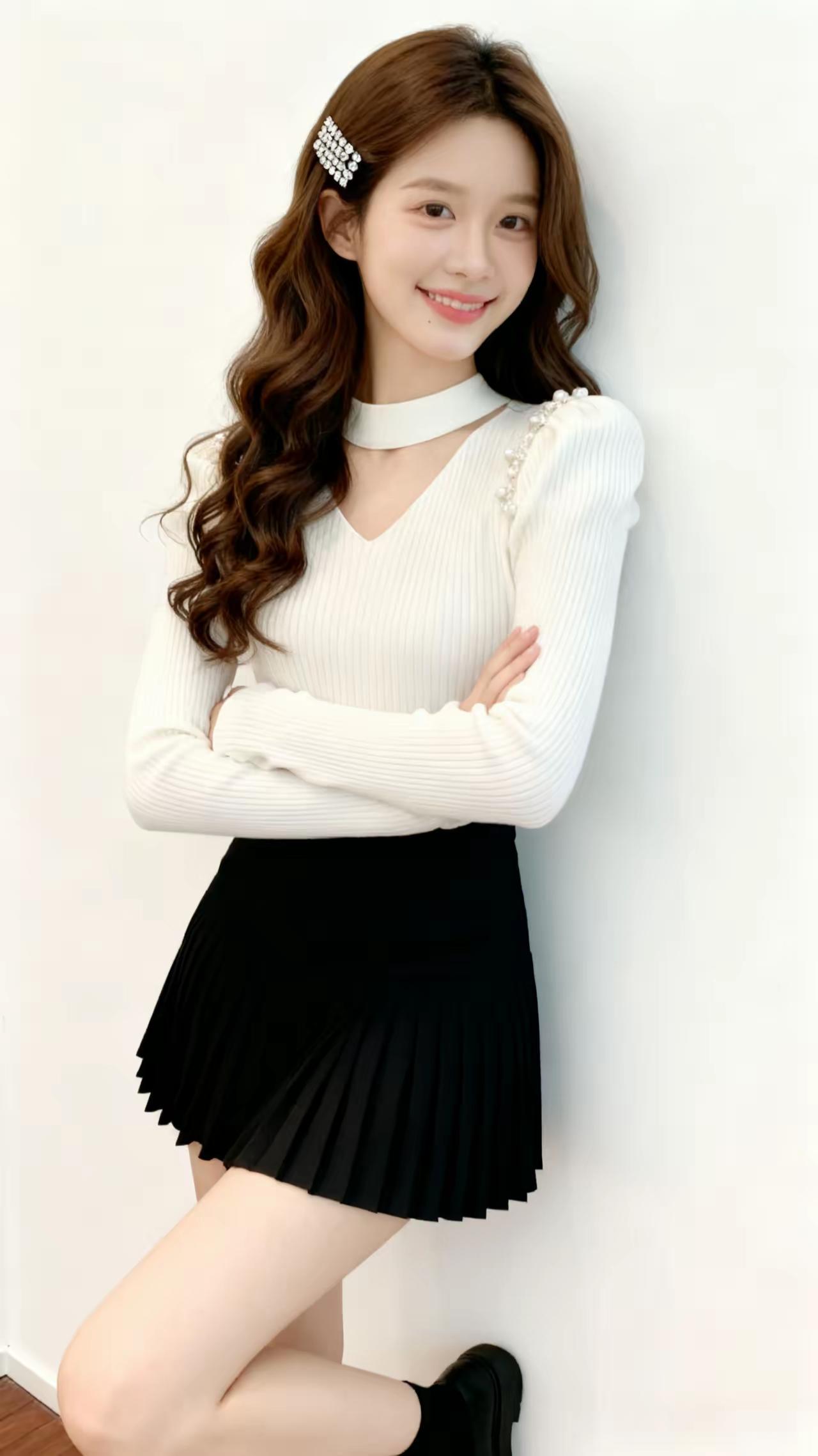 甜美少女风穿搭,白色毛衣搭配黑色百褶裙,清新可爱!