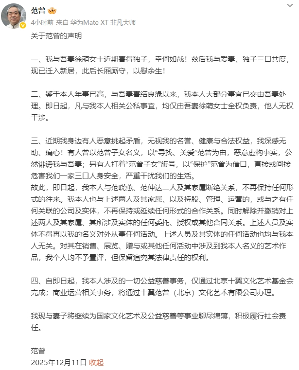 范曾宣布与女儿继子断绝关系 实在没想到,会有这样的后续发展高龄生育子女,是有听说过。如著名的墨多克和邓文迪,借助试管婴儿辅助手段,在70和72岁生了两个女儿。范曾这个87岁“喜得独子”,AI说是“现代华人群体中属首次公开记录”。全球范围内,有两个印度农民创造了94岁和91岁的纪录。一个是2010年,94岁的Ramjit Raghav在自然情况下成为父亲,被记录为世界上最年长的父亲,他80多岁时已生育多个孩子,证明男性在极高龄仍可能保留生育能力;一个是2007年,91岁的Nanu Ram Jogi生下第21个孩子。感觉后面还会有事,但我个人选择相信奇迹!这应该不至于公然造假吧?名人更不会。墨多克的小孩都很大了,是可以的。如果不是奇迹,那也是很不简单的一个事,足够震撼。