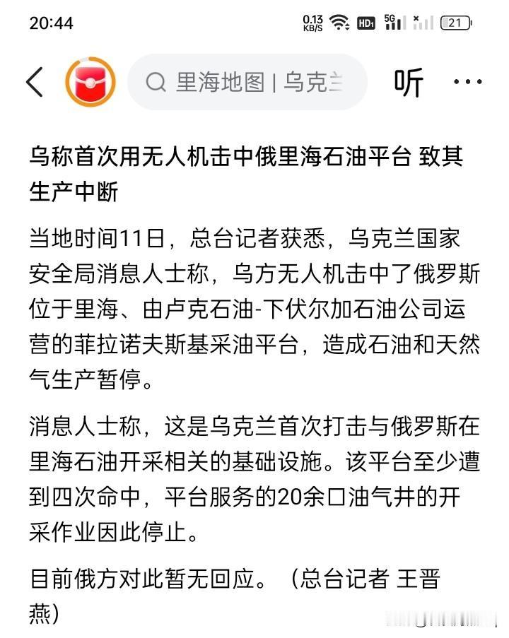 又袭击新地区、新目标? 今天有消息说,乌克兰的无人机发射的无人机,至少四次击中了远离乌克兰1500公里之外的里海俄罗斯石油、天然气开采平台,并且还至少造成20口油气井的开采停止。 首先,1500公里之外的目标,一般的自杀式无人机的航程,无论如何是无法达到的。要么就是乌克兰最新研制出来了超过1500公里航程的无人机。另外,就是发射无人机的地点就可能不是乌克兰本土,而是被无人艇运到了黑海的某个地方,才实施发射。当然,在其它的国家发射无人机,也可以解决无人机航程的问题,但可能性不大。 但不管怎么说,乌克兰对俄罗斯的袭击,又增加了新的区域。