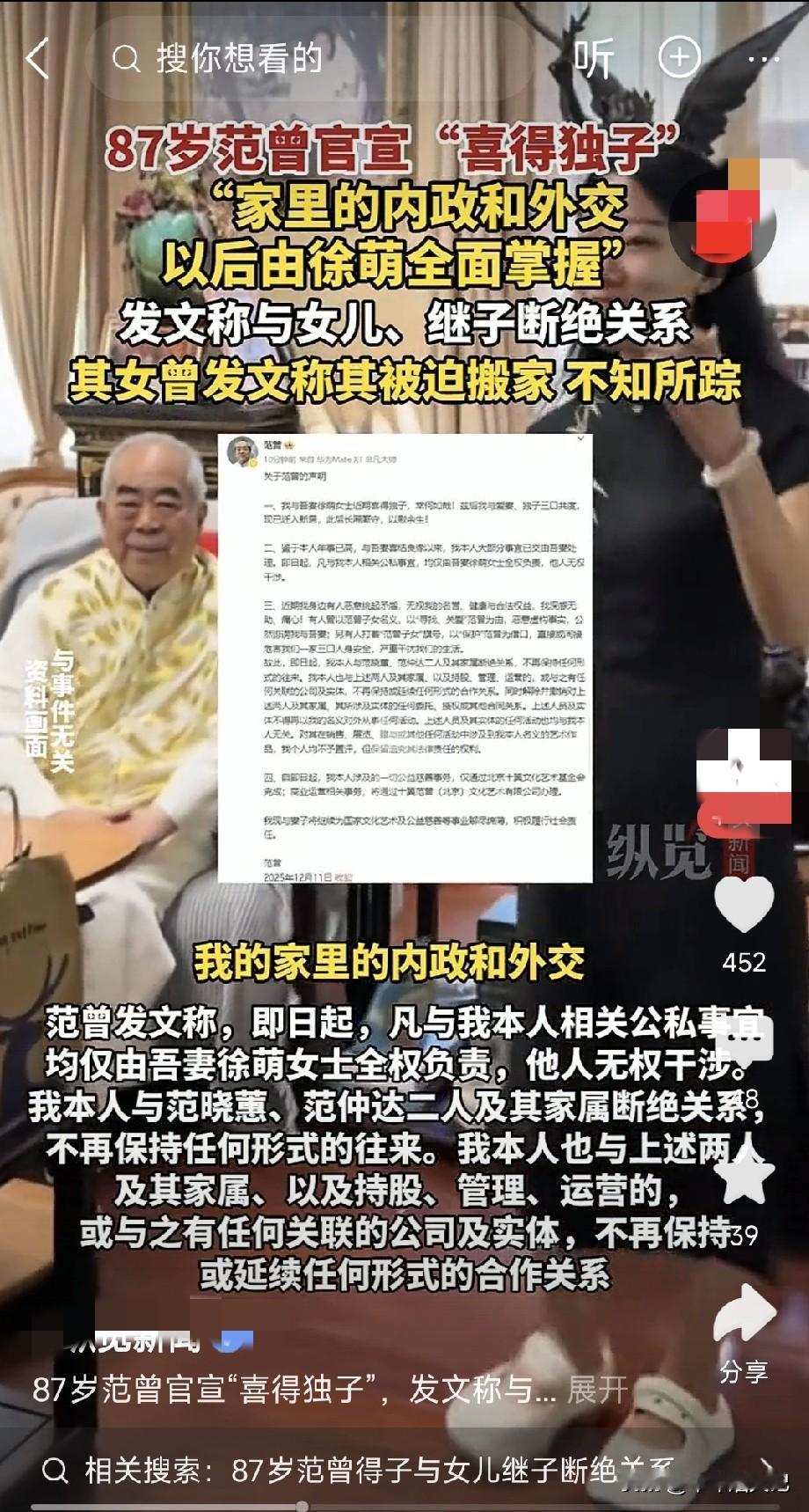 范曾87岁得子,最让人心疼的不是被断绝关系的继子,也不是站出来说话的亲生女儿——而是那个刚出生、还不会哭只会哼的小儿子。 现在他1个月,爸爸87岁; 他3岁上幼儿园,爸爸90岁; 别的孩子爸爸扶着走路,他扶着爸爸走路[泣不成声] 别的孩子爸爸带着踢球、骑马,他爸坐在旁边慈祥的看着他[泣不成声] 他上小学,爸爸93岁; 开家长会,同学问:“这是你爷爷吗?” 等他上初中,正叛逆呢,想顶嘴,一回头,爸没了。 不是怪谁,只是这孩子来得太晚了。 父爱如山?可山没来得及靠,就塌了。 家缠万贯?可钱买不来一个陪他长大的爸爸。 爱的再深,终究也扛不住时间差!