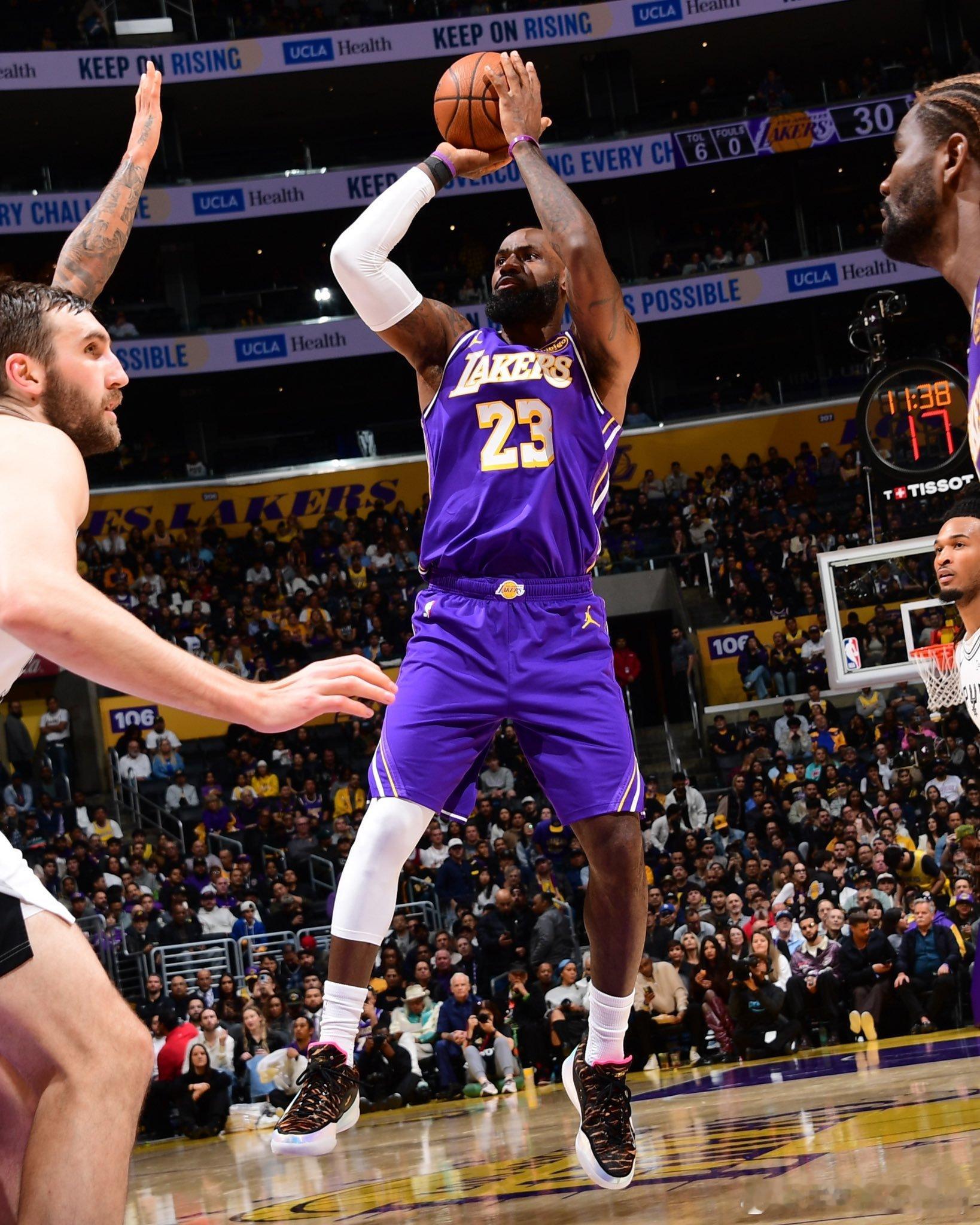 数据表现不错,詹姆斯今日对阵马刺14中7,三分3中0,罚球6中5得到19分15篮板8助攻3盖帽,正负值-16全队倒数第二,首发最低。詹姆斯隔扣马刺vs湖人