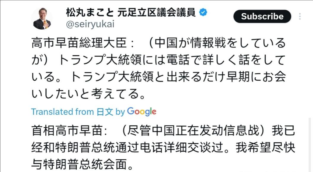高市早苗再次出来回应了,日本明显顶不住压力了! 12月10日,日本议员松丸诚写到,日本首相高市早苗表示:中国正在开展情报战,我已通过电话与特朗普总统进行了详细沟通,并且希望能尽早与他会面。很显然,在美国国务院出来表态,声称中国的行为不利于地区和平与稳定。 这场危机的导火索要追溯到辽宁舰编队西太演训期间,当日本自卫队战机闯入中方划定的演习区域,歼-15舰载机依法依规实施驱离,却被日方颠倒黑白为“危险照射”。 高市早苗政府的反应堪称教科书式的三重策略:先由防相小泉进次郎出面“强烈抗议”,接着首相本人亲自上阵要求中方“保证不再发生”,最后外务省召见中国大使递交抗议书。 这套组合拳看似强硬,实则暴露心虚——中方次日便公布现场录音,清晰记录日机主动抵近的全过程,连美国军事专家都私下承认“日方挑衅在前”。 真正让东京坐立不安的,是中方反制的节奏与力度,从外交部连续三天的强硬表态,到驻日使馆公开驳斥“中国威胁论”,再到民间舆论场掀起的对日批评浪潮,日方突然发现过去屡试不爽的“碰瓷外交”失灵了。 更关键的是,中国在涉台问题上的红线被高市早苗亲手点燃——她此前宣称“台湾有事即日本有事”,尽管事后私下承认“说过头了”,却在国会辩论中拒绝撤回言论,直接导致中日关系降至邦交正常化以来的冰点。 此刻高市急于拉拢特朗普,本质是想借美国右翼势力对冲压力,自民党内部文件显示,她的幕僚团队正在研究2026年1月达沃斯论坛期间的美日首脑会晤方案,甚至考虑邀请特朗普参观日本新成立的国家情报局。 这个被反对党批评为“军事扩张工具”的机构,正是高市情报战叙事的实体支撑——根据10月执政协议,日本计划将现有情报机构升格,重点监控所谓“中国渗透”。 但讽刺的是,连《社会新报》都撰文指出,这种对美亦步亦趋的姿态,反而让日本沦为“华盛顿的政策试验田”。 美国的态度微妙得耐人寻味,国务院发言人虽称“美日同盟稳固”,但措辞远不如俄乌冲突时激烈;海军陆战队司令特纳的“不退缩”表态,更像是给盟友吃的定心丸。 中方看得透彻,外交部在12月10日的记者会上直接点明:“日本的盟友尤其要提高警惕,不被带节奏。” 事实上,美国智库的兵棋推演早已显示,介入台海对美日而言“代价难以承受”,这种战略清醒与日本右翼的赌徒心态形成鲜明对比。 日本国内的分裂正在加剧,反对党立宪民主党虽支持强化对美合作,但公开批评高市“忽视民生搞对抗”;连自民党内部都有声音担忧,持续炒作“中国威胁”会透支日本的外交资源。 最尴尬的是,当高市试图用“情报战”转移视线时,中国驻日大使吴江浩直接甩出证据——近三年日本对华情报活动频次激增40%,新设的7个驻外机构中5个针对中国。这种“贼喊捉贼”的戏码,让东京在国际舆论场愈发孤立。 截至12月11日,中日海空对峙区域的侦察机频次下降60%,但外交战仍在升级,高市早苗的电话外交没能等来特朗普的实质承诺,反而等来了中国外交部的“三连问”:是否承认《中日联合声明》?是否放弃干涉台海?是否停止军事挑衅?这三个问题直击日本战后秩序的根基,也是高市政府最不敢正面回答的核心。 当日本媒体开始讨论“是否重蹈2012年购岛覆辙”时,或许他们更应该明白:今天的中国,早已不是当年那个可以用“切香肠”战术试探的对手了。 这场危机的本质,是日本右翼试图借美国大选前的混乱期,赌一把“以危促变”的战略投机,但他们低估了两个现实:一是中国维护主权的决心和能力今非昔比,二是美国国内对华政策的分歧正在撕裂同盟信任。 当高市早苗在国会强撑“不撤回涉台言论”时,东京街头的抗议人群已举满“不要战争”的标语——这或许才是日本真正顶不住的压力:民意的天平,正在从极端右翼向理性回归。