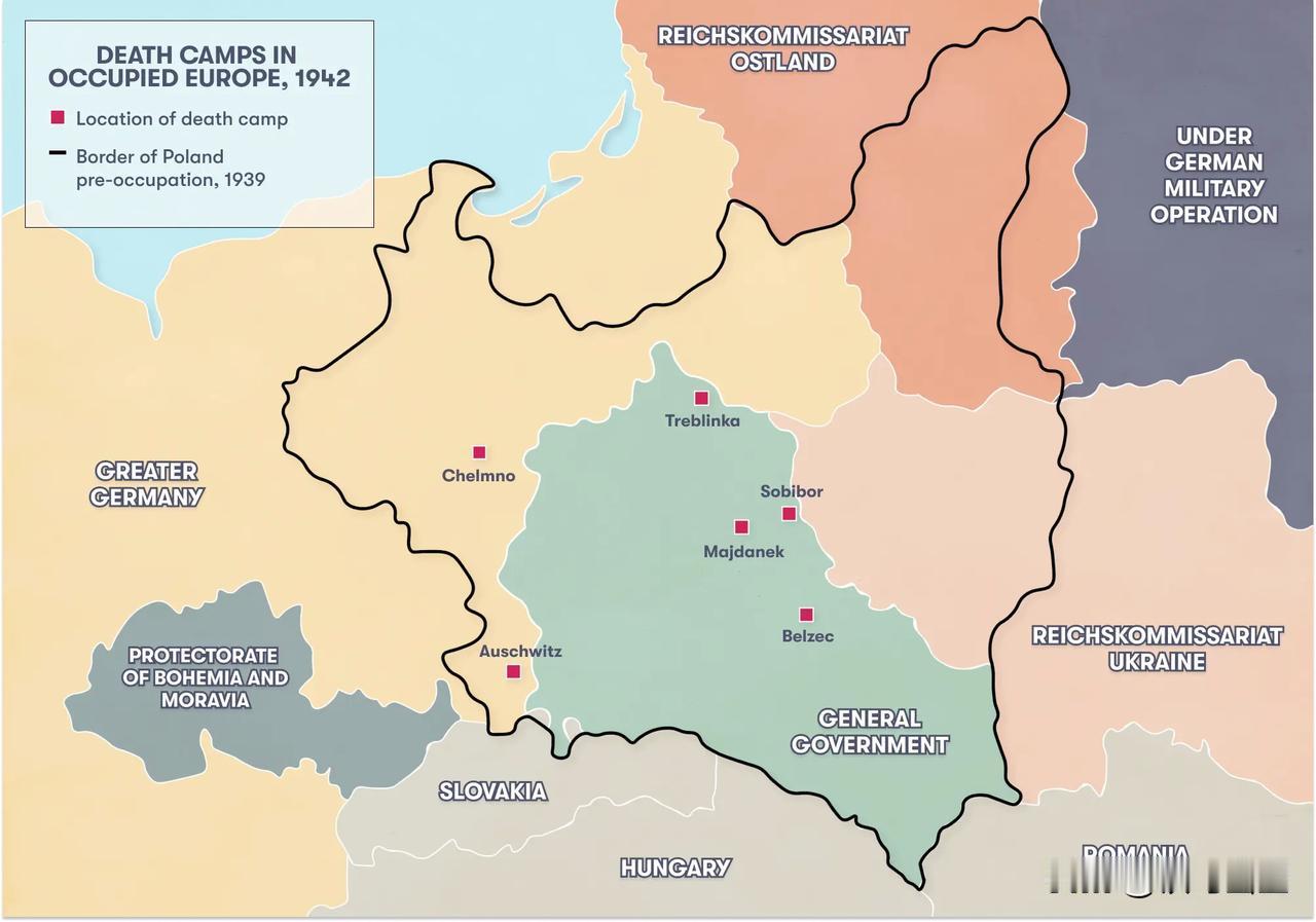 本图展示了1942年纳粹德国在被占领欧洲设立的死亡集中营分布。 所有死亡集中营(红色方块标记)均位于波兰境内,包括奥斯维辛(Auschwitz)、特雷布林卡(Treblinka)、索比堡(Sobibor)、马伊达内克(Majdanek)、贝尔泽克(Belzec)和海乌姆诺(Chelmno)。 其中,特雷布林卡、索比堡、马伊达内克、贝尔泽克集中在波兰被纳粹划为“总督府”(General Government)的区域内。 集中营 二战波兰 二战地图 历史 二战