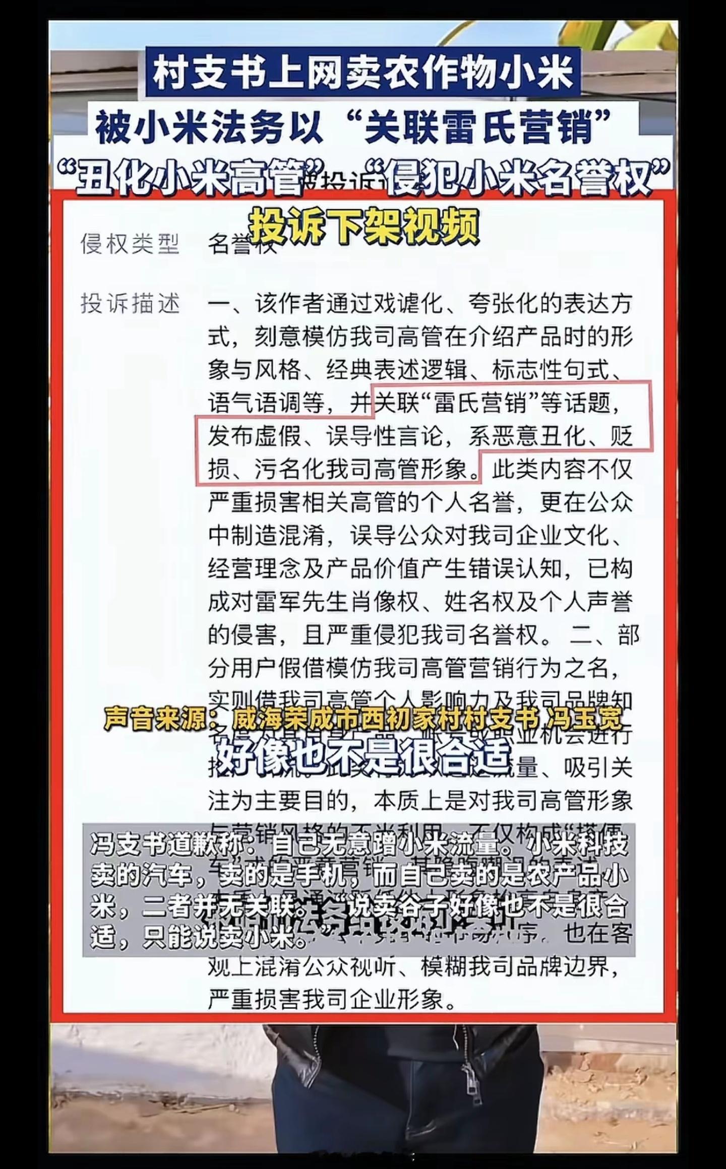 看了下原视频,并没有不让村支书卖小米。小米可以卖,小米可以说,小米可以吃,小米没问题,京东淘宝打开搜,滑下去很多黄小米。卖小米就卖小米,卖小米为什么关联“雷氏营销”?不关联话题谁管你,出了名没必要让小米背锅。这个行为不是卖小米被投诉的,而是蹭话题被投诉的,不蹭“雷氏营销”这个话题,能有什么问题?
