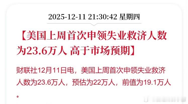 美国上周首次申领失业救济人数为23.6万人 高于市场预期。