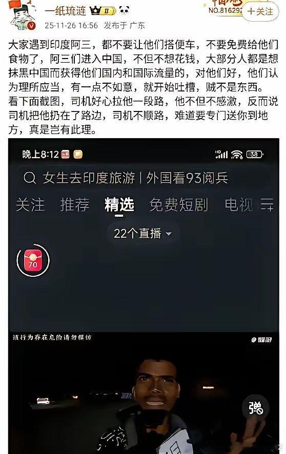 有些印度人真让人捉摸不透。之前有印度女孩来中国,面对毛鸡蛋就吐槽中国饮食不卫生,还觉得中国不如印度干净。可也有印度旅游博主诺玛迪克,在中国穷游75天后,直呼中国超发达,回去就像从城里到了乡下。更搞笑的是,有的印度人前面说中国不如印度干净卫生,签证到期却在网上装可怜不想回去。咱国内有些人还圣母心泛滥去安慰、出主意。他们自己生活里都有一堆事儿要操心,还有闲工夫管他们回不回去,还是多关注关注自己家庭的生活吧。