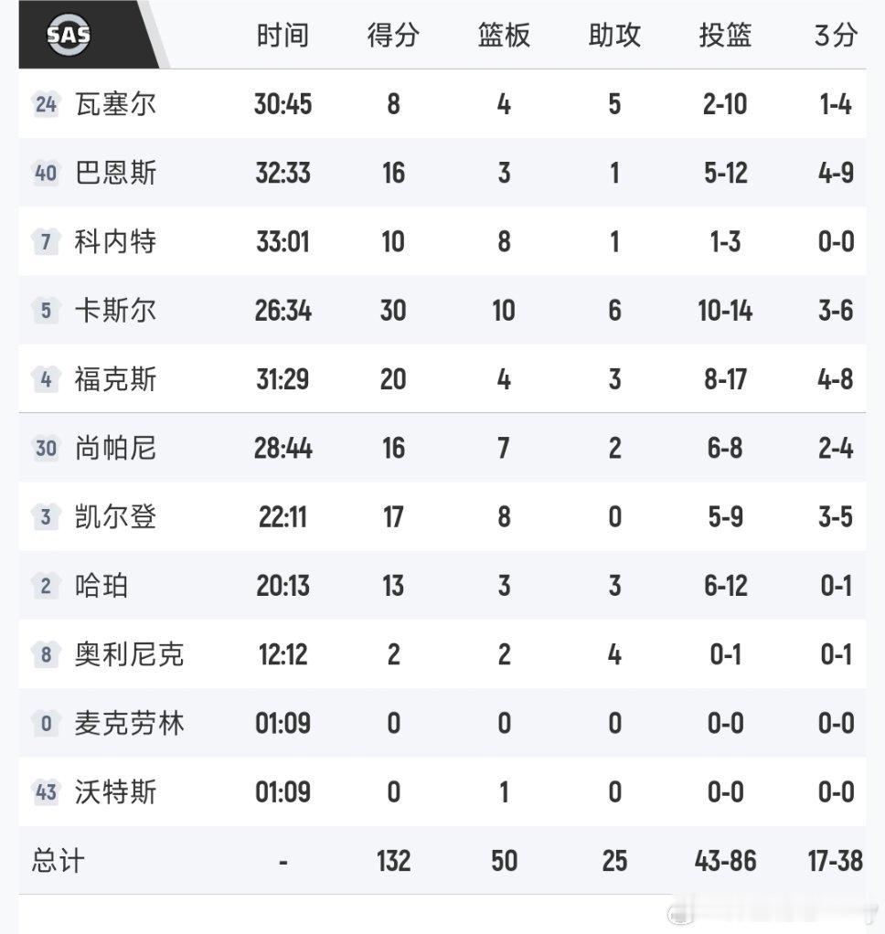 马刺132-119淘汰湖人,挺进NBA杯4强。下一场将对阵雷霆。卡斯尔30分10篮板,福克斯20分,东契奇35分,斯玛特26分,里夫斯16投15分,詹姆斯19分15篮板8助。马刺淘汰湖人卡斯尔撤回了湖人的大逆转