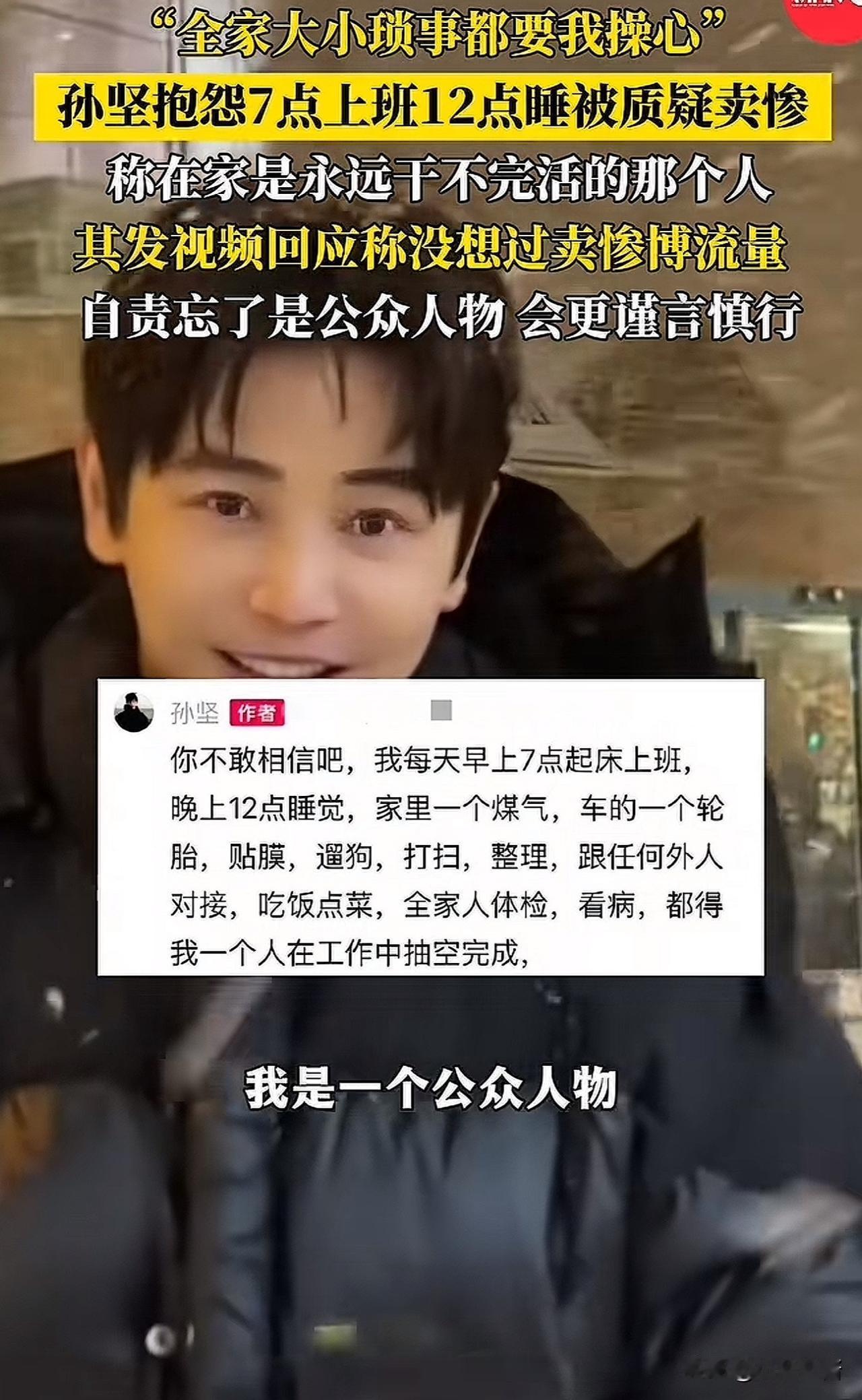 乖乖,这是娱乐圈最惨的男明星吧 37岁的孙坚,至今没有结婚,深夜不睡觉的他,眼睛哭的通红,诉说自己委屈,他说:一个人要干全家的活,每天从早上7点,忙到晚上12点,不仅要工作,还要照顾家人,包括:遛狗、手机贴膜、吃饭点菜,换轮胎、修煤气罐、安排全家体检就医等,所有事都要连轴转。 看到孙坚通红的双眼,很明显,这件事让他很心累,关键家人还不知感恩。 压倒骆驼的,有时候就是一根稻草。 据悉,孙坚是重组家庭,弟弟比他小10岁,今年刚结婚,是继父带来的。当年,继父病重,为了生活,孙坚连续轧戏、每天仅睡四小时,靠藿香正气水续命,攒下45万医药费,还默默还清继父留下的200万债务,为继弟操办了耗资不菲的婚礼,亲手送上50万钻石项链。 为了讨好继子,母亲经常让他“多做点”,稍有迟疑就会被指责。 有网友心疼他,也有网友指责他“卖惨”,哪个家庭主妇,不是从早忙到晚,何况孙坚是大明星,压根不缺钱花。 你们觉得呢?[泪奔]