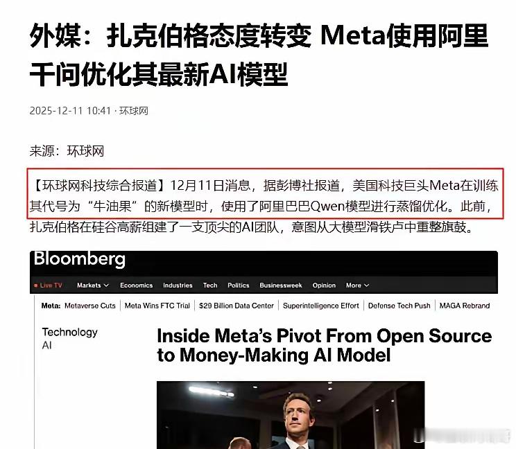 形势彻底变了,Meta最新模型曝光,和中国有关,“西谷东阿”局面已经形成!彭博社最新消息指出,美国开源霸主Meta新模型“牛油果”项目,选择了蒸馏谷歌的Gemma以及中国阿里千问开源模型。这事很不简单,因为在这之前,包括英伟达、微软、爱彼得等众多科技巨头就已经在选择阿里千问。如今就连美国最强开源模型也向中国开源模型低头。这不但证明了阿里千问的强大,同时,随着阿里千问横扫硅谷,也说明“西谷东阿”的局面已经彻底形成,西方AI看硅谷,东方AI看阿里不再是一句玩笑话,而是成了现实。当然,这其实并不奇怪,阿里的成功并非偶然,关键原因在于两点:第一,开源策略的成功。阿里的AI开源是非常彻底的,从2023年到如今,仅仅2年时间,阿里通义团队已经开源了300多款模型,开源范围涵盖了文本生产模型、语言理解模型、文生图及视频模型等全模态模型,同时在尺寸上,也是全尺寸的开源。正是这种极致的开源策略,造就了其衍生模型数超18万,全球下载量超7亿的局面,真正坐稳了全球第一开源模型宝座。第二,具有全栈AI布局能力。这是阿里千问第二个杀手锏。目前全球范围内,阿里是唯二拥有全栈AI布局能力的企业。从底层芯片到云基础设施再到生态体系,阿里都有所布局,并且能力都非常的强,这一点是其他企业无法比拟的。唯有美国谷歌可以一较高下。英伟达CEO黄仁勋曾说,阿里千问是世界上最好的开源模型,这话真是一点没说错,如今的阿里千问已经彻底成为了中国AI对外的一张名片,成了西方眼中东方AI的焦点所在!