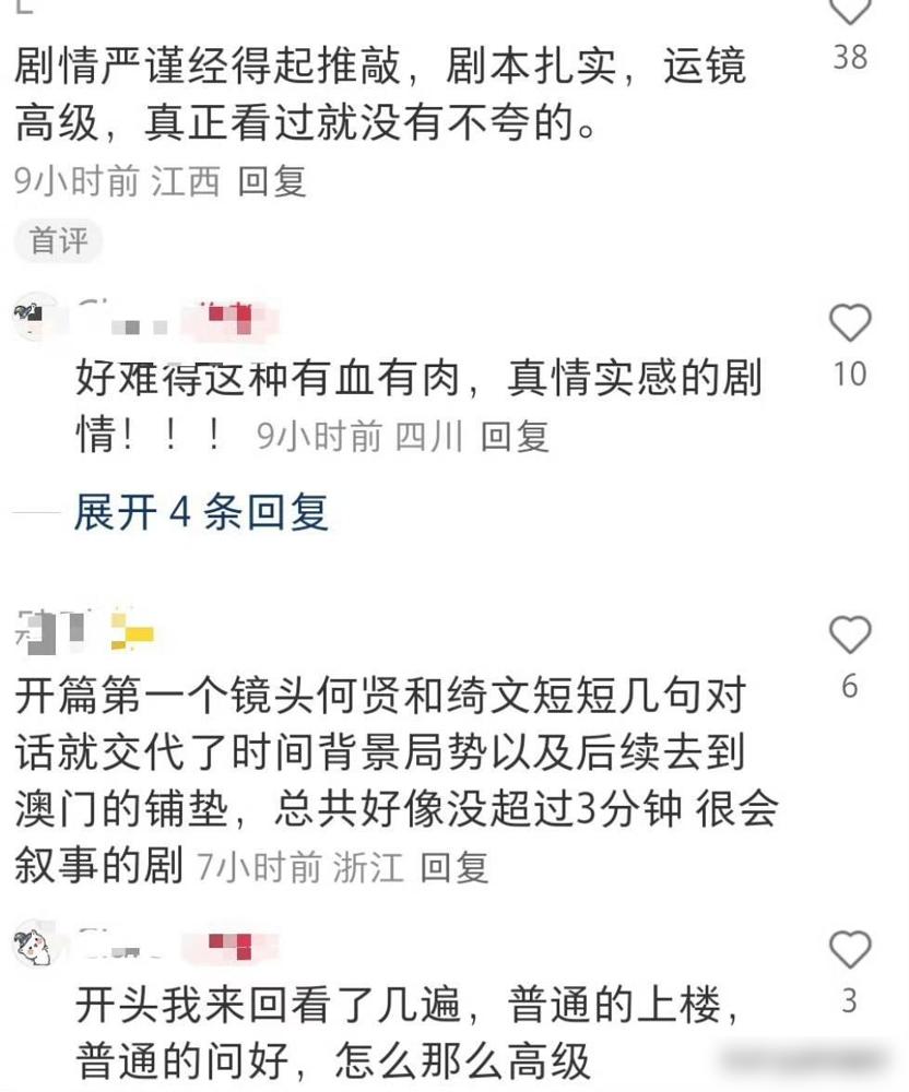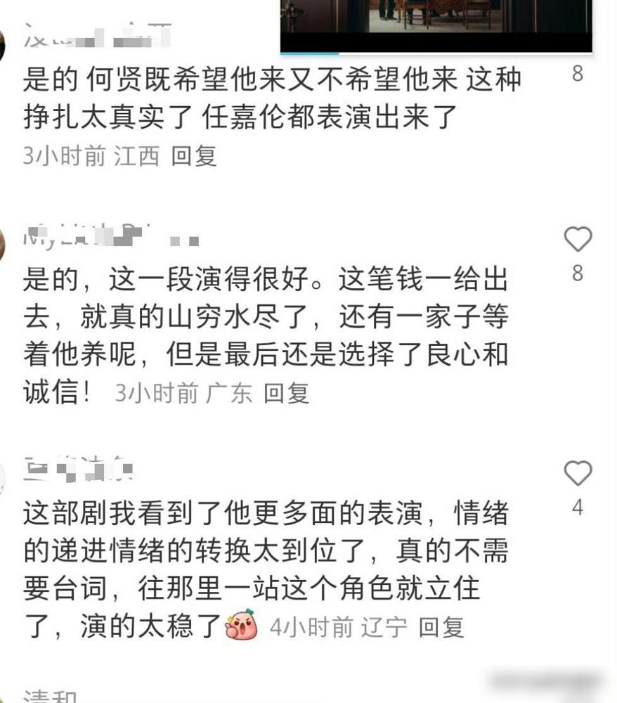风与潮播出后, 任嘉伦收获大量好评, 任嘉伦表演细腻,注重细节, 在乎逻辑,惯用眼神, 内心戏丰富, 他没有浪费每一次的表演, 而现在的观众也都是细节控, 在细微的表演上看到端倪, 在任嘉伦表演开保险柜,给黄取钱的慢动作中,分析出他当时的状态,任嘉伦确实没人让人失望,他做到了,何贤稳稳的立住了。 我看下来大概就是,剧里这个角色一上来并没有什么大场面,就是靠这些细微动作把性格慢慢立住的。 说个细节,我更在意的是他在那些停顿里的情绪起伏,观众能读到的东西,其实都是他提前想好的节奏。 还有一点挺有意思,大家现在看剧越来越像侦探,一帧帧扣着看,我感觉这反而逼着演员必须把逻辑走满,不然立刻穿帮。 然后想到一个对照,很多角色容易被“厉害”“狠”这些外壳带跑,但他这次的稳是从行为里渗出来的,不是靠台词堆的,这点还挺难得。 我自己感觉这也解释了为什么大家会愿意反复看那个开保险柜的片段,动作慢,但信息密度很高。 说不准后面剧情还能怎么玩,但至少现在这个角色的骨架已经站得挺牢的。