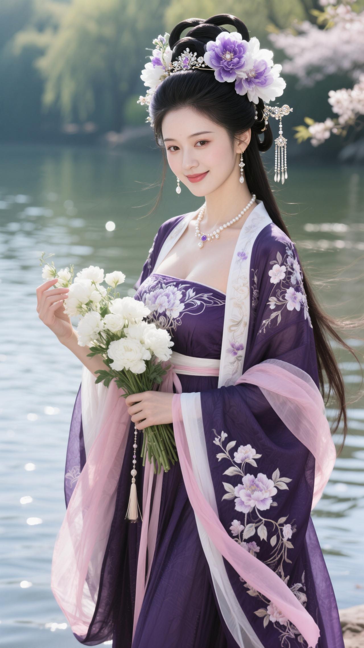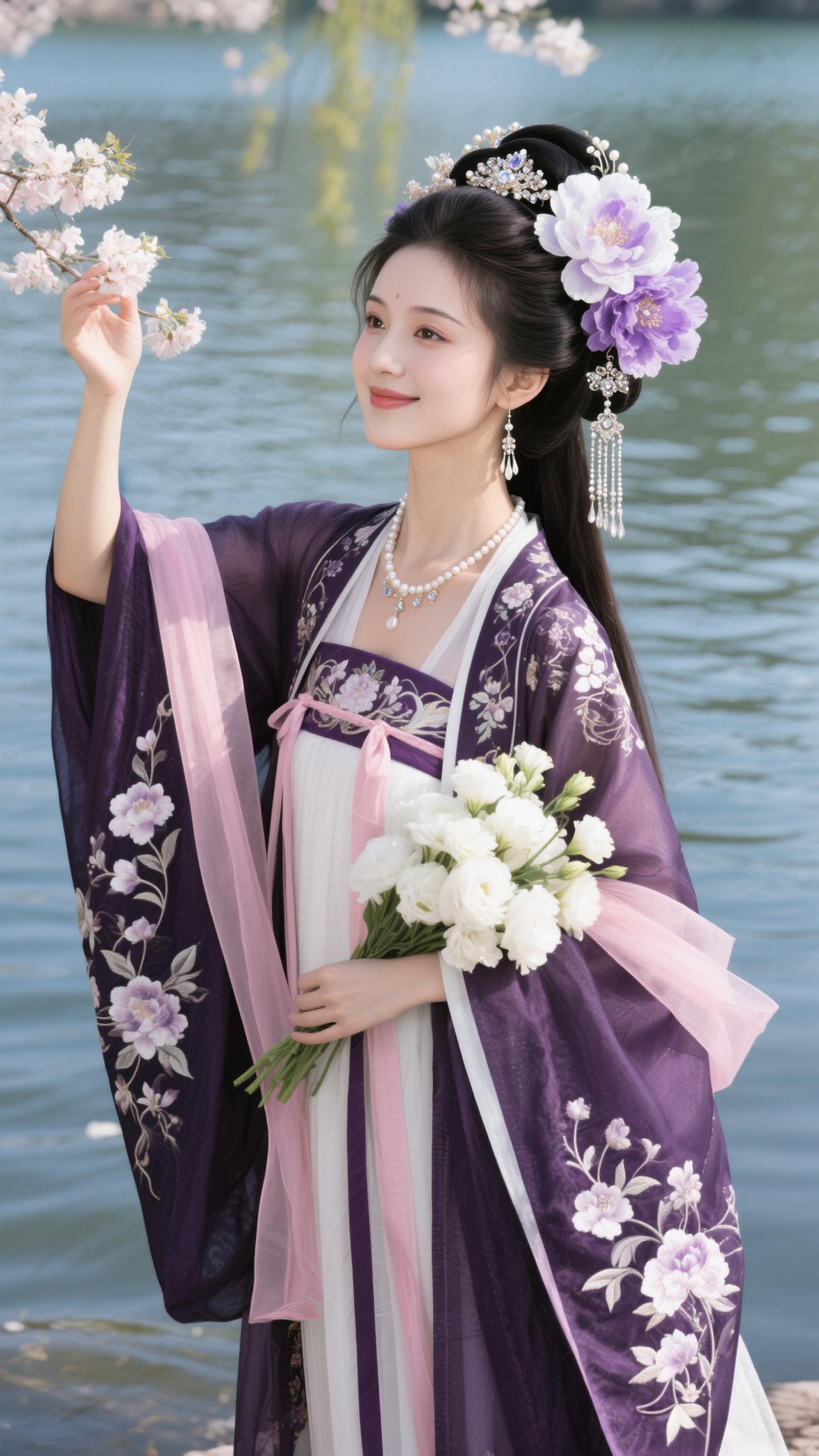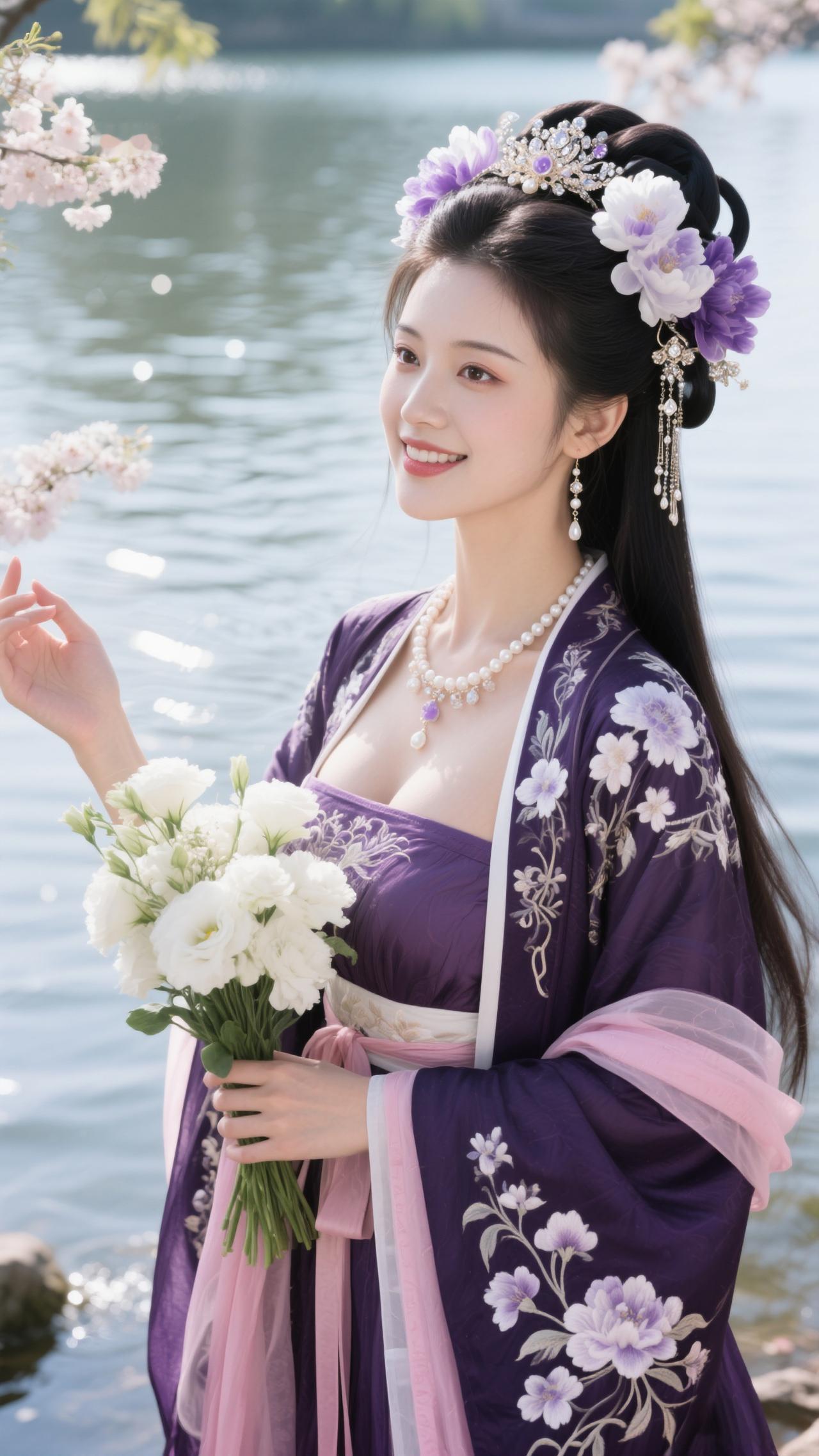 一襟香软,半袖风柔,都作春情。汉服写真 原创古风计划 国风古韵 古风美女 汉服造型 《诉衷情·紫裳持花》 紫绡裁袂粉绡轻,花簇鬓边明。 湖光漫浸罗裙,樱瓣落盈盈。 拈雪蕊,步晴汀,笑相迎。 一襟香软,半袖风柔,都作春情。