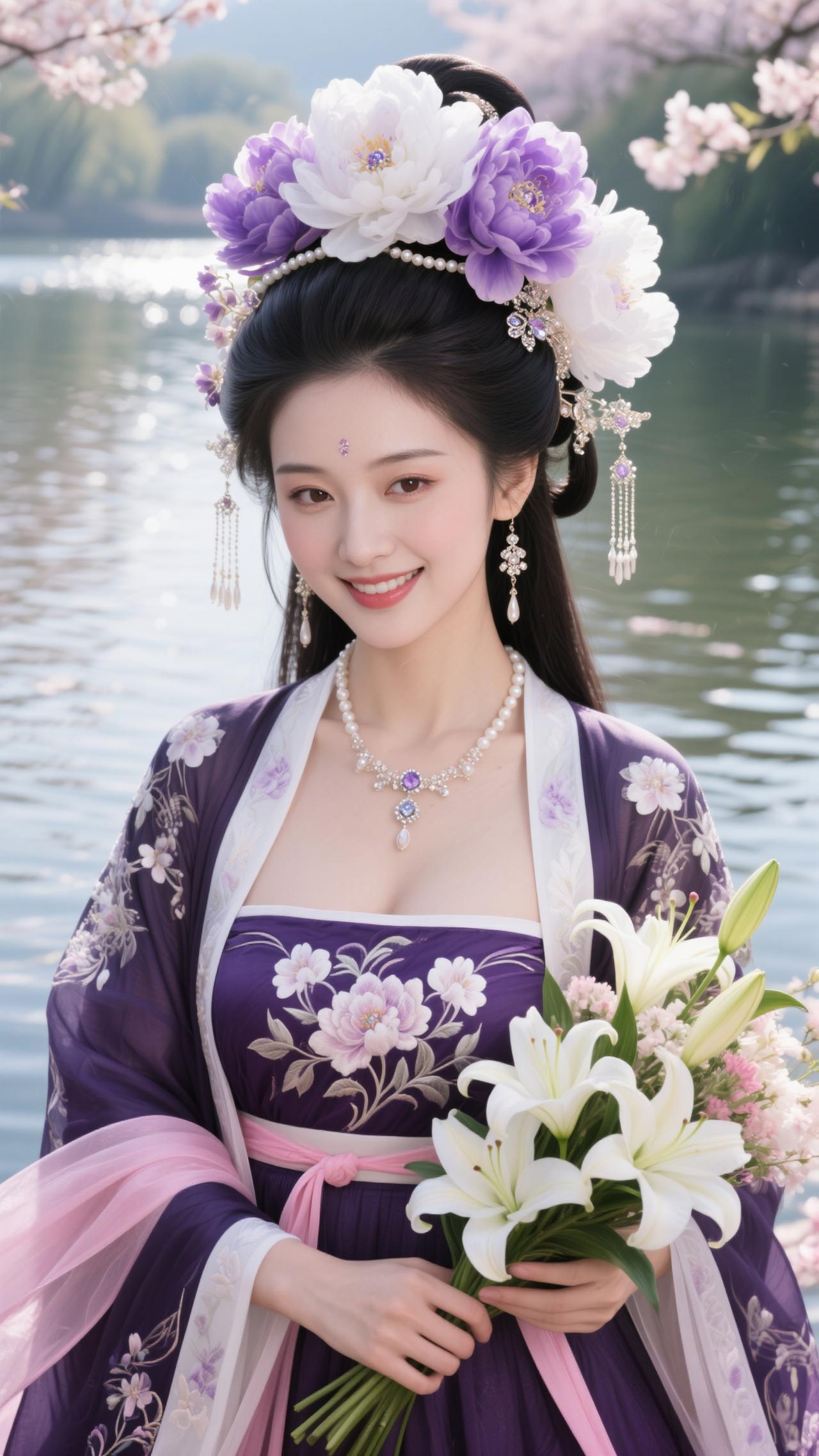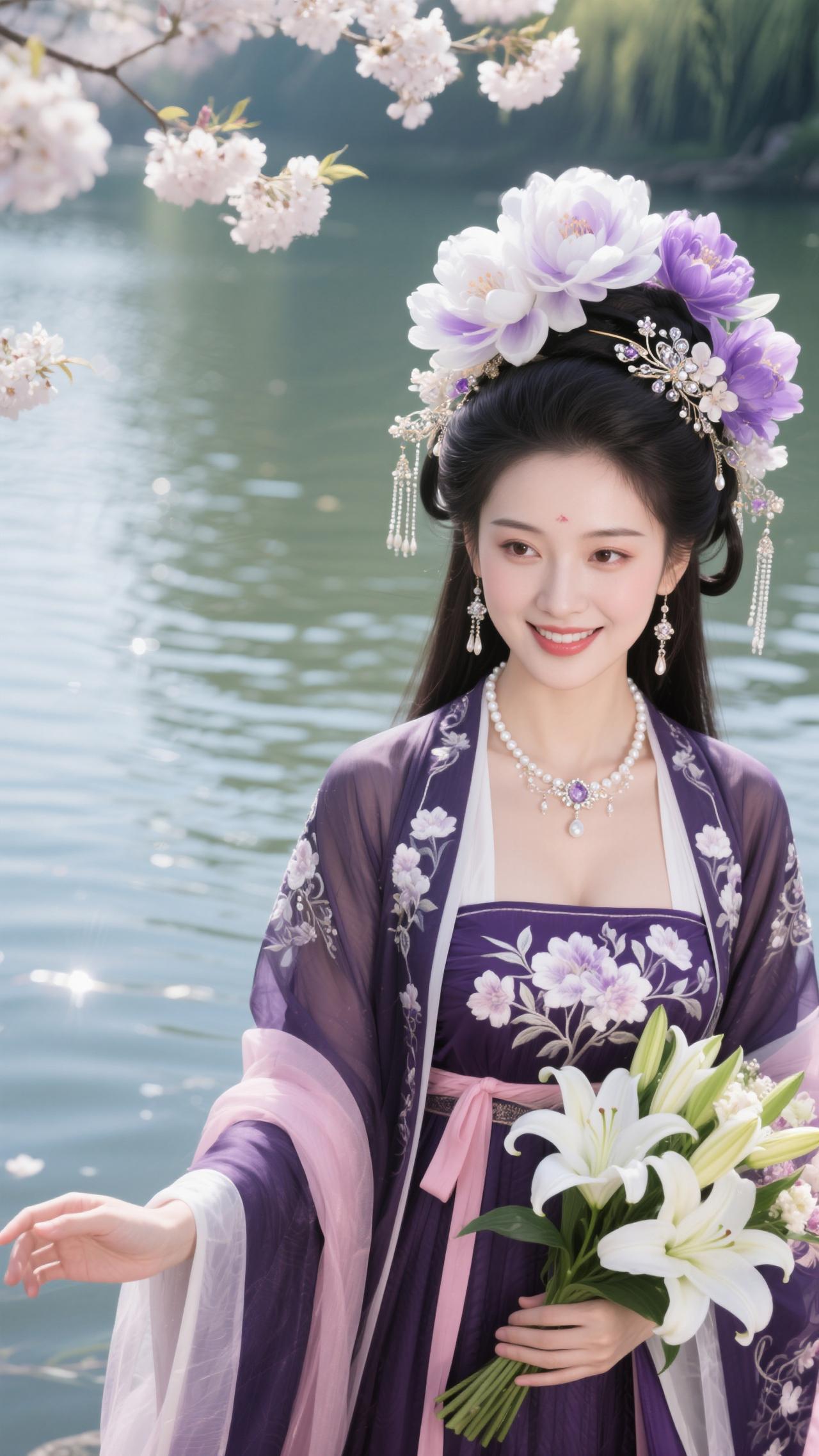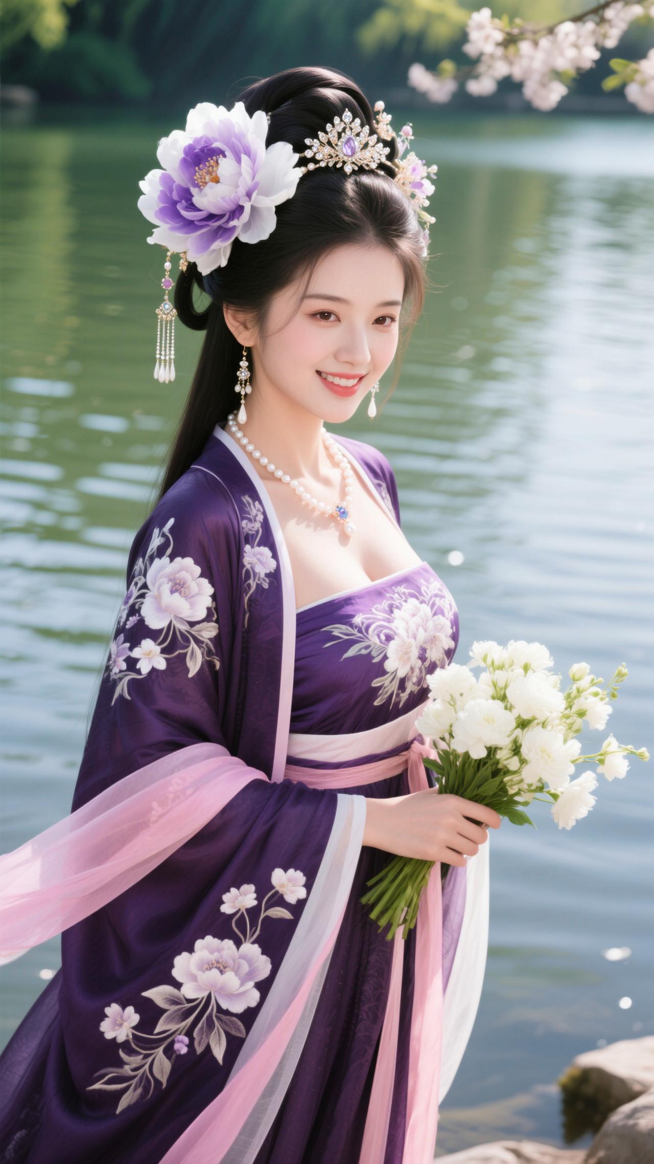 一襟香软,半袖风柔,都作春情。汉服写真 原创古风计划 国风古韵 古风美女 汉服造型 《诉衷情·紫裳持花》 紫绡裁袂粉绡轻,花簇鬓边明。 湖光漫浸罗裙,樱瓣落盈盈。 拈雪蕊,步晴汀,笑相迎。 一襟香软,半袖风柔,都作春情。
