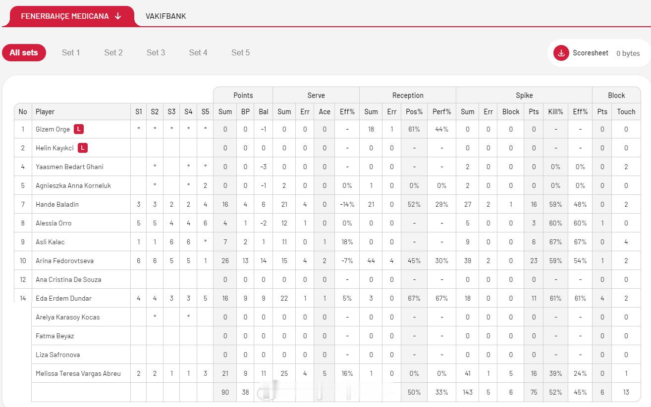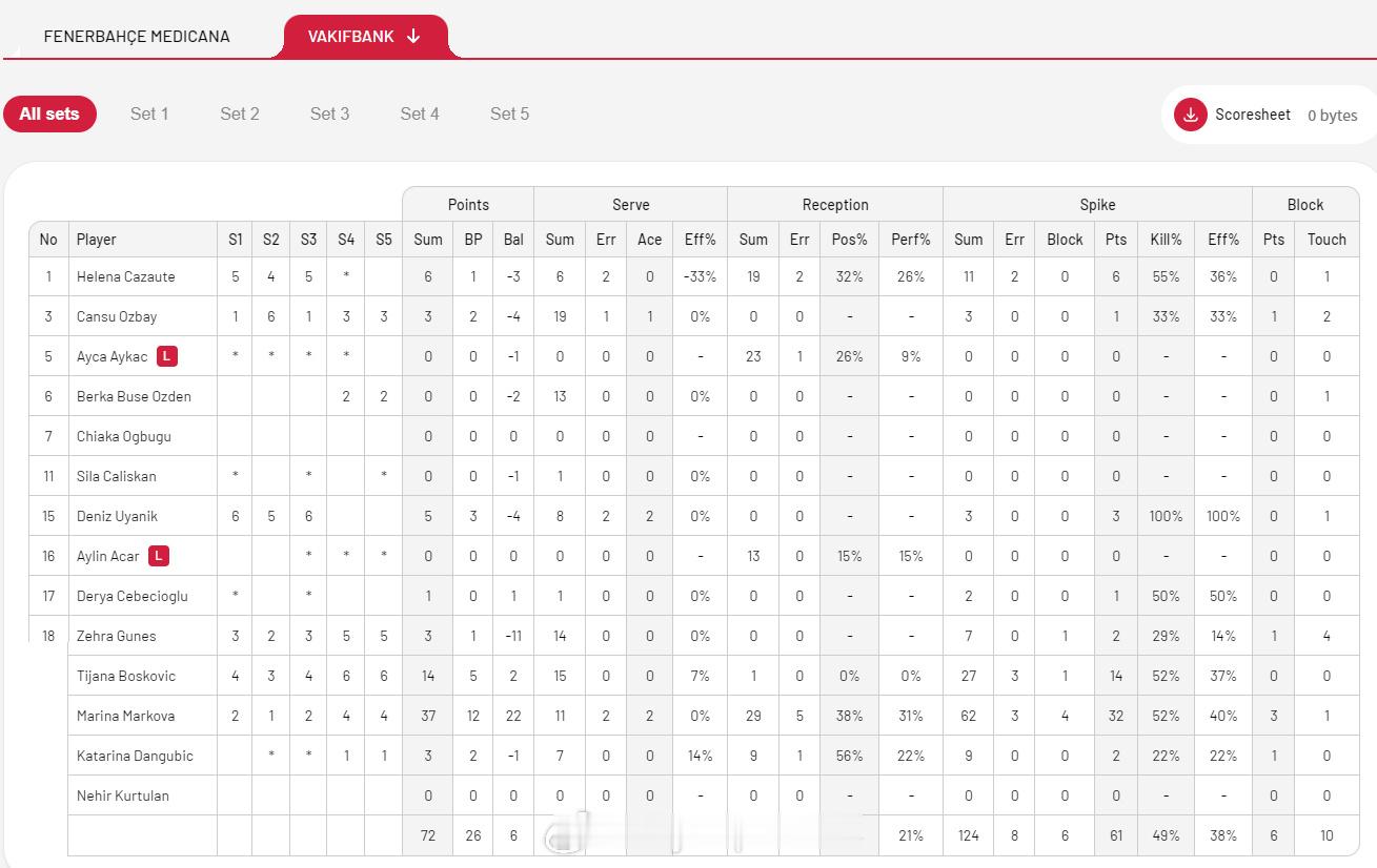 【土超女排瓦基弗3-2力克费内巴切取十连胜 马尔科娃37分】国际排坛战报速递 12月11日,土超女排第10轮焦点战,瓦基弗银行客场3-2(14-25/25-21/17-25/25-23/15-13)力克老对手费内巴切,成为唯一全胜球队继续排名联赛榜首。马尔科娃37分(62扣32中3拦2发)、博斯科维奇14分,费多罗夫采娃26分、巴尔加斯21分、巴拉丁和艾达各16分。