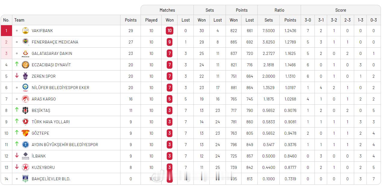 【土超女排最新积分榜:瓦基弗全胜领跑 加拉第三伊萨升至第四】国际排坛战报速递 12月11日,土超女排第10轮战罢,瓦基弗银行十战全胜领跑,费内巴切9胜1负排名次席,加拉塔萨雷7胜3负23分继续位列第三,伊萨奇巴希7胜3负20分回升至第四,泽伦竞技7胜3负20分降至第五,同为7胜3负20分的尼吕费尔排名第六。