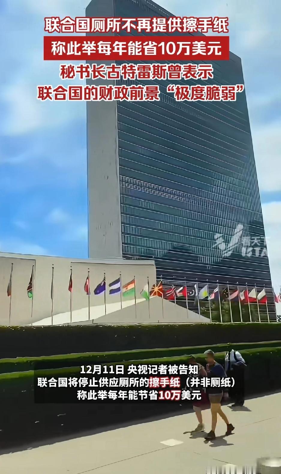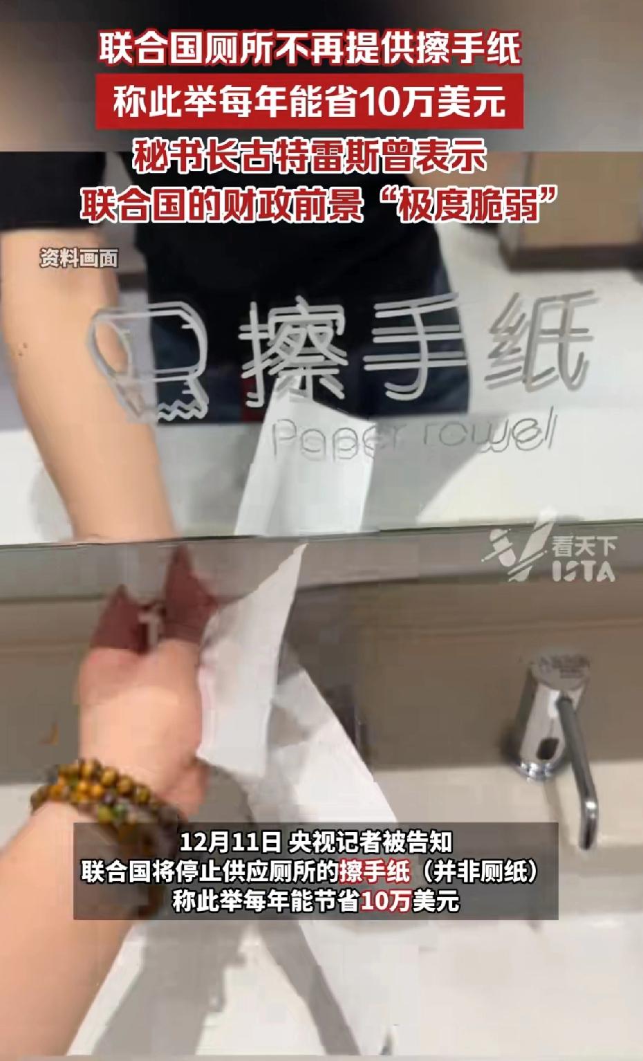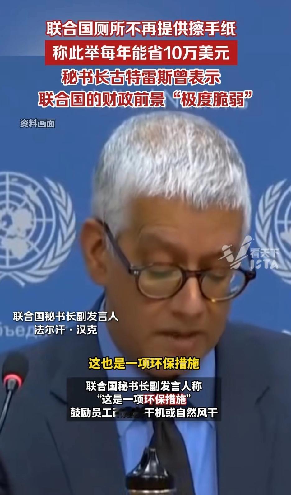 联合国厕所不再提供擦手纸,说是每年能省10万美元,还美其名曰环保措施。 秘书长古特雷斯表示:联合国的财政前景“极度脆弱” 联合国财政有多紧张可想而知,毕竟截至12月1日,会员国拖欠的会费总额已达15.86亿美元,美国就是那个最大欠费户,截至9月底就拖欠约15亿美元。 反观中国,早早全额缴纳了今年6亿8573万美元的常规会费。 在这种情况下,联合国省这10万美元的擦手纸钱,真是有点心酸。 只是没想到需要节省到这样了,连手纸钱都要扣。 美国欠那么多钱不还,联合国也没办法,只能在擦手纸上抠搜,真让人唏嘘。 只能催“美国赶紧偿还联合国的擦手纸” 如果不是美国欠着高达15亿美元的会费,联合国怎么可能连手纸都拿不出来。[捂脸][捂脸][捂脸]